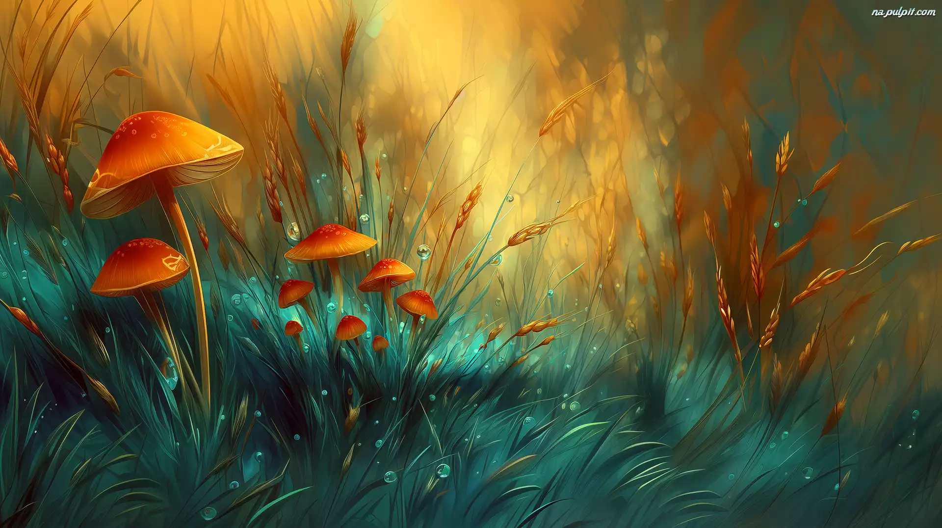 Czerwone, Grzyby, Trawa, Grafika AI Na Pulpit