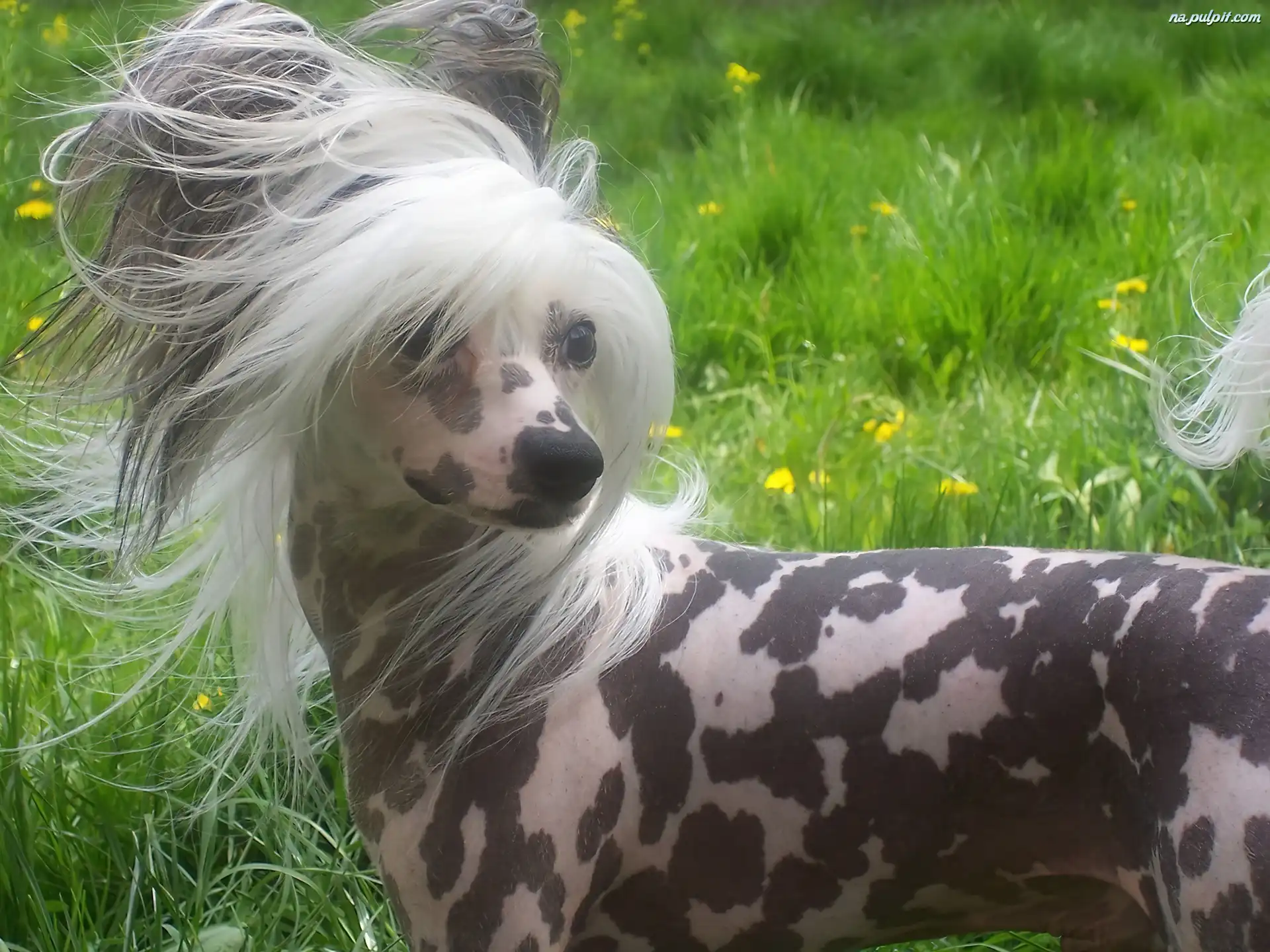 Piesek, Koc Chiński Grzywacz, Łąka Chiński Grzywacz, Trawa Język, Piesek, Wiszący Obroża, Grzywacz, Chiński, Czerwona Pysk, Biały, Chiński Grzywacz