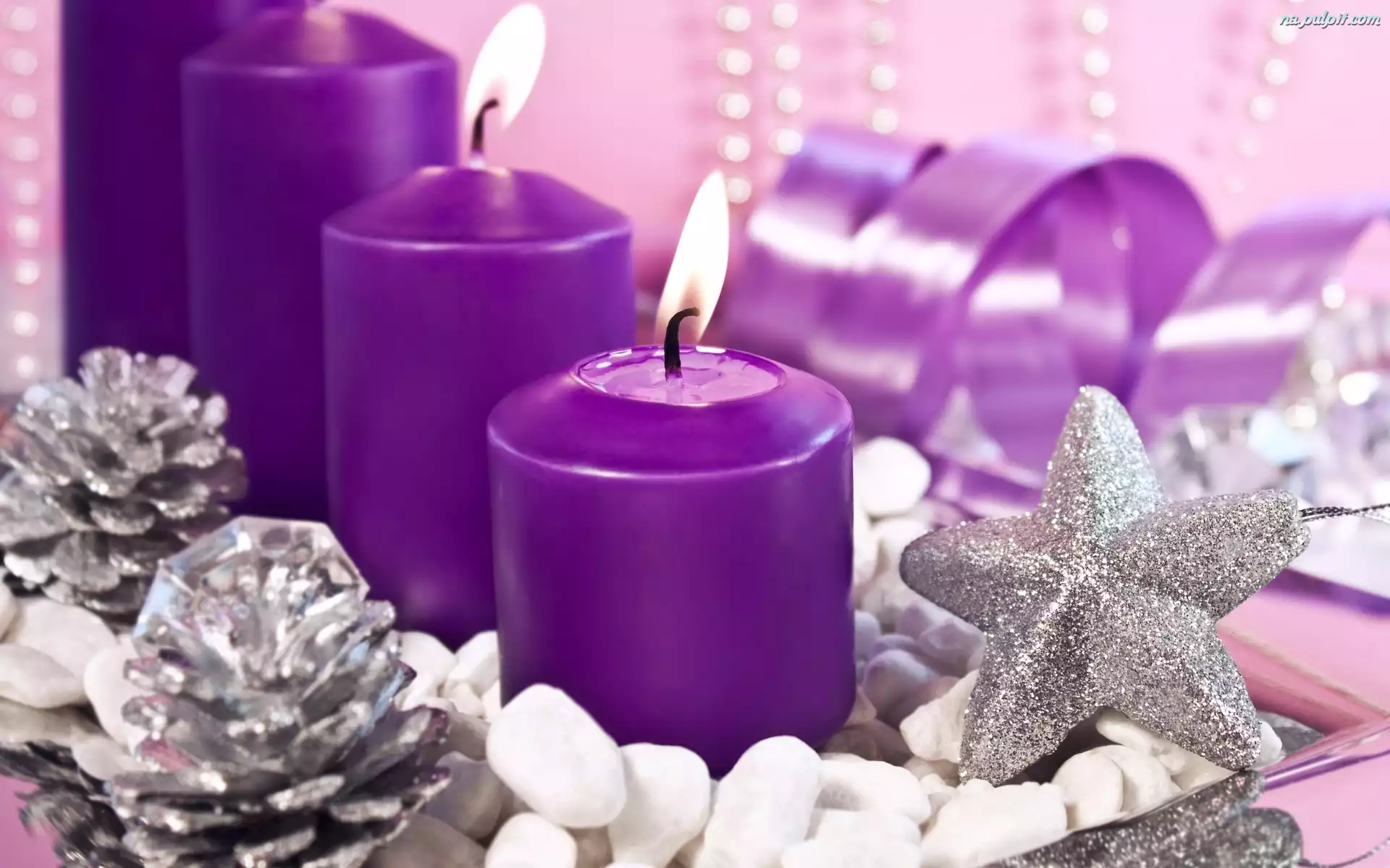 Fioletowe, Gwiazdka, Dekoracja, Świeczki, Szyszki, Wstążka Na Pulpit