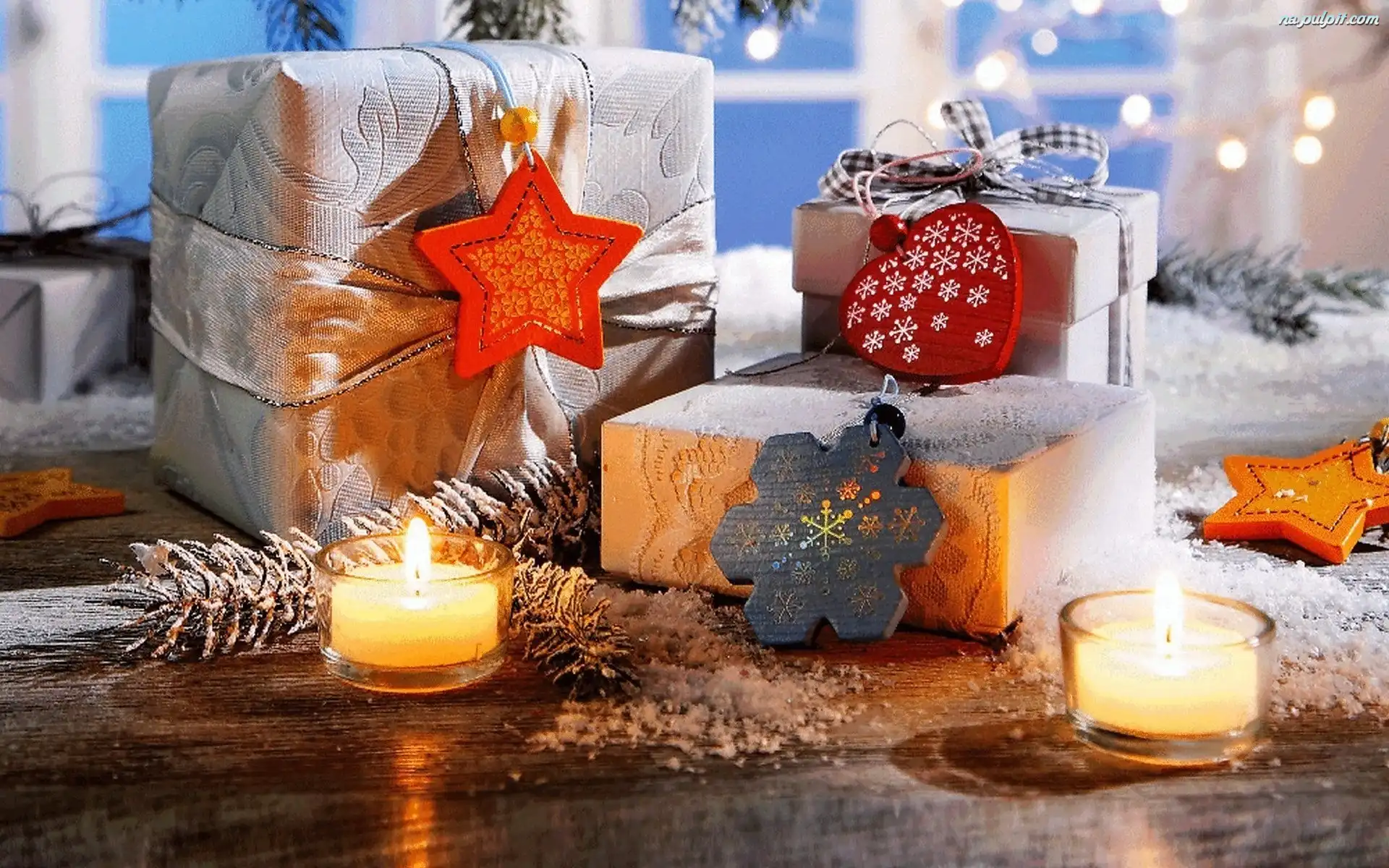 Gwiazdki, Gałązki, Świece, Prezenty