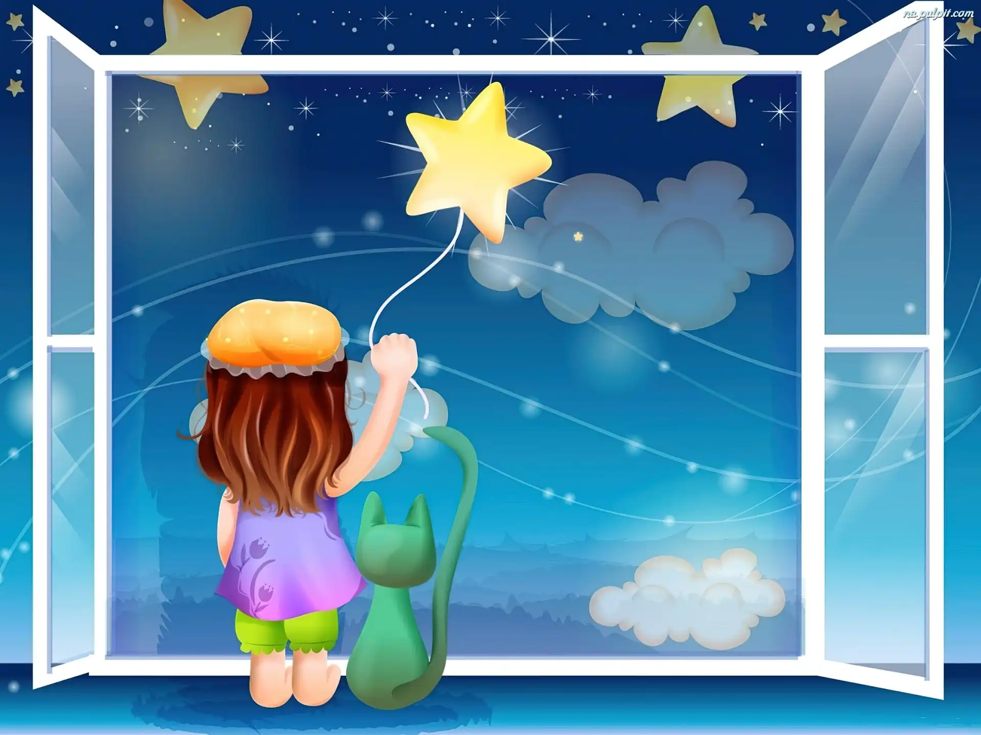 Gwiazdy, Okno, Kot, Dziecko, Noc Na Pulpit