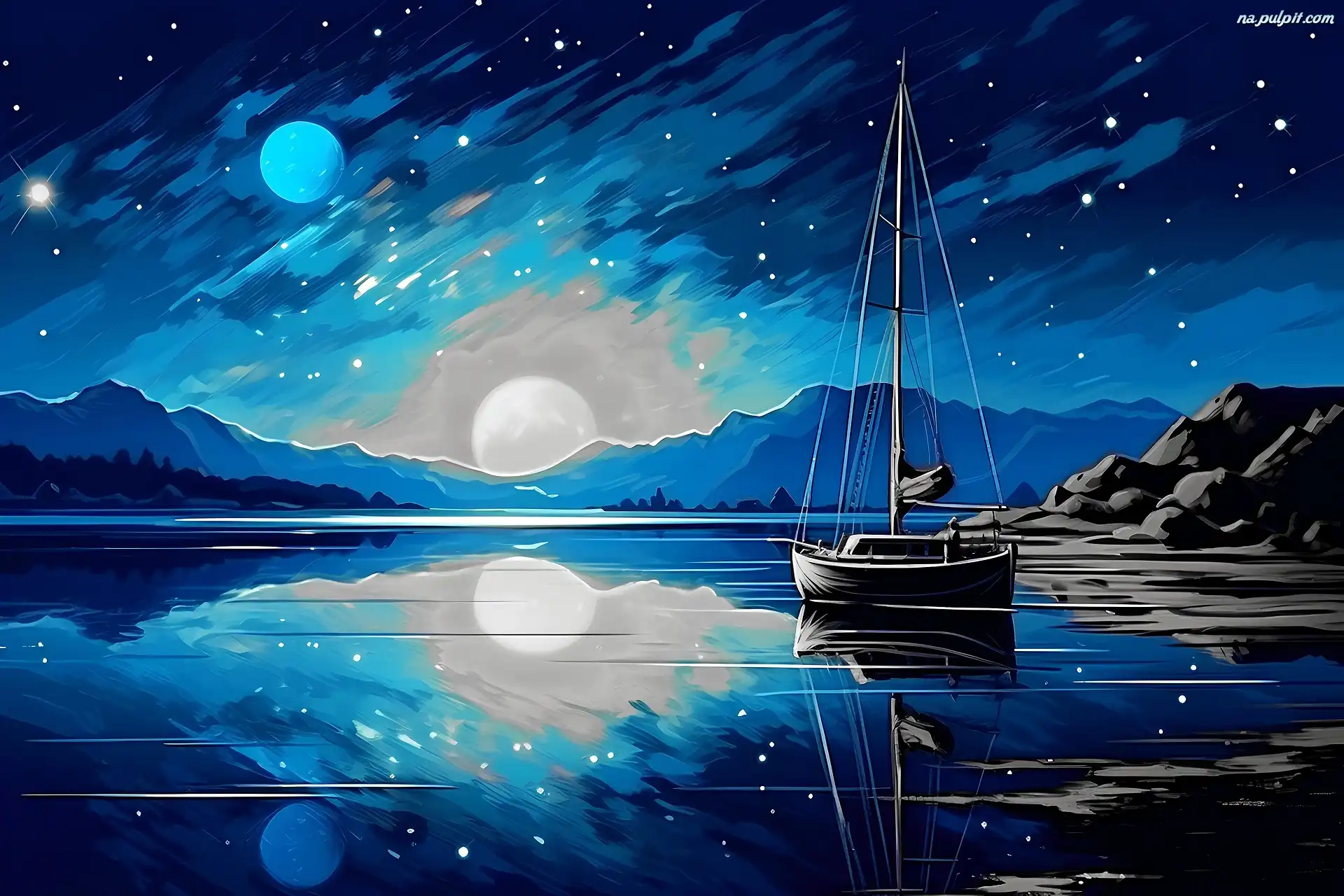 Księżyc, Żaglówka, Noc, Gwiazdy, Jezioro, Grafika Na Pulpit