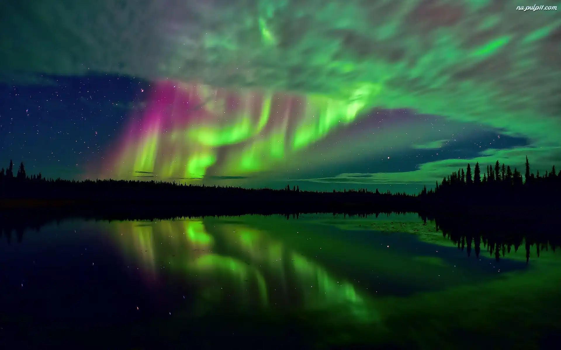 Gwiazdy, Jezioro, Zorza Polarna, Las