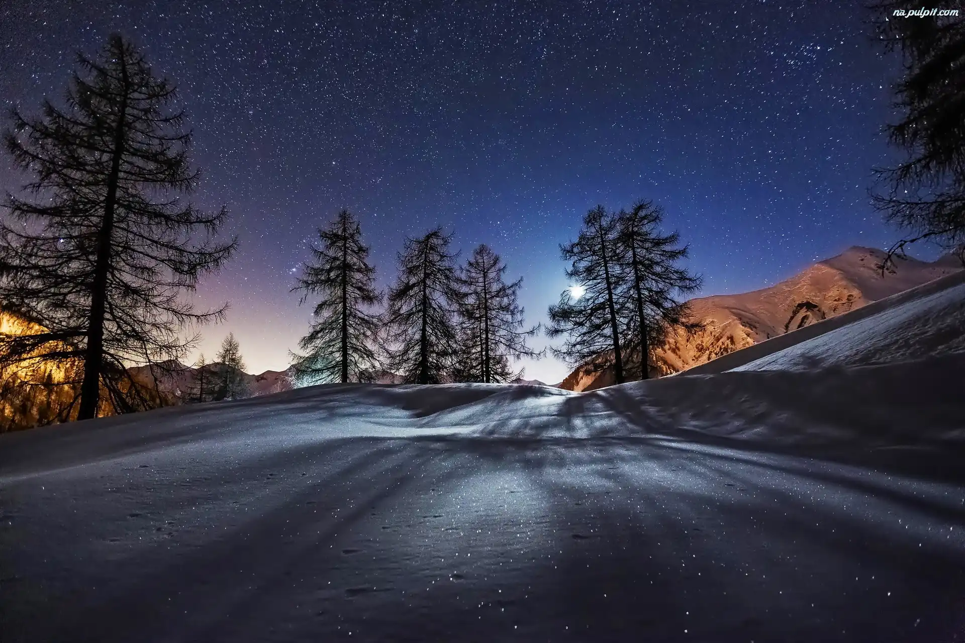 Gwiazdy, Góry, Noc, Zima, Drzewa Na Pulpit