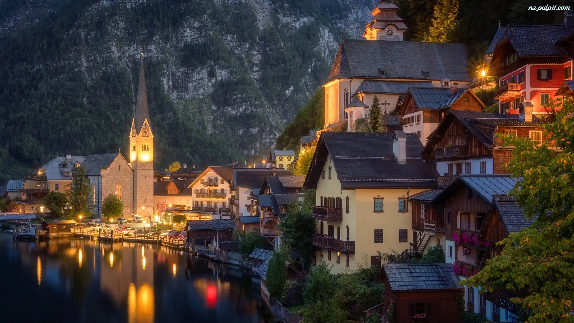 Austria, Kościół, Góry, Jezioro Hallstattersee, Oświetlone, Domy, Hallstatt Na Pulpit