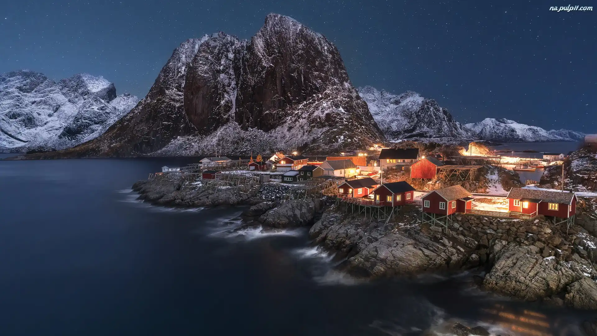 Domy, Lofoty, Wyspa Moskenesoya, Wieś Hamnoy, Ośnieżone, Góry, Morze Norweskie, Norwegia, Oświetlone Na Pulpit |