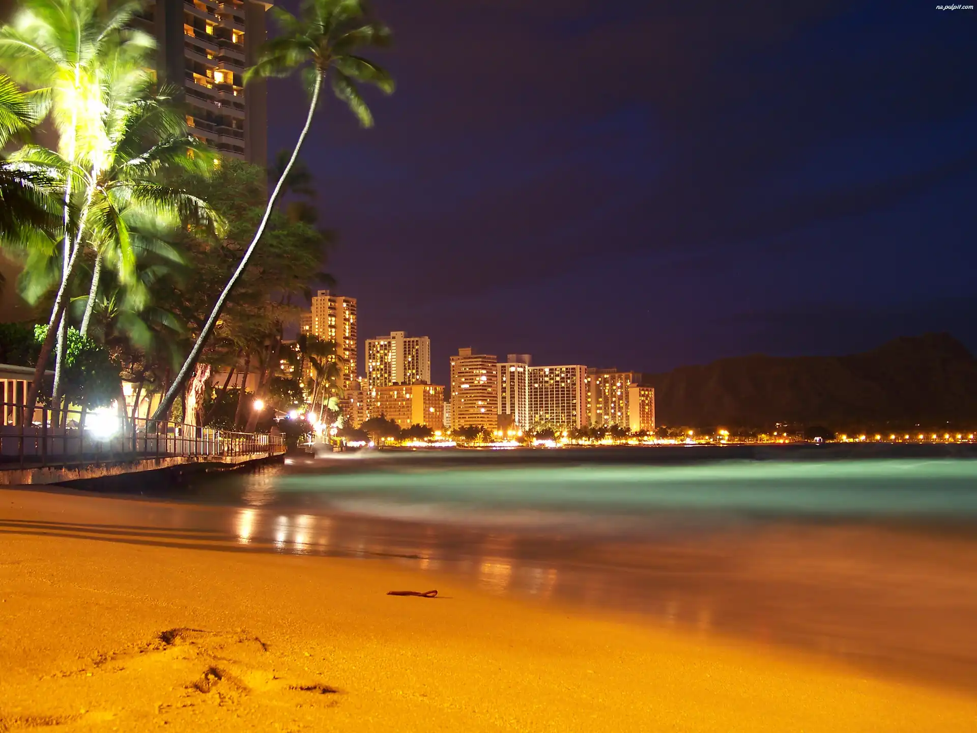 Hawaje, Palmy, Wieżowce, Piasek, Waikiki, Woda