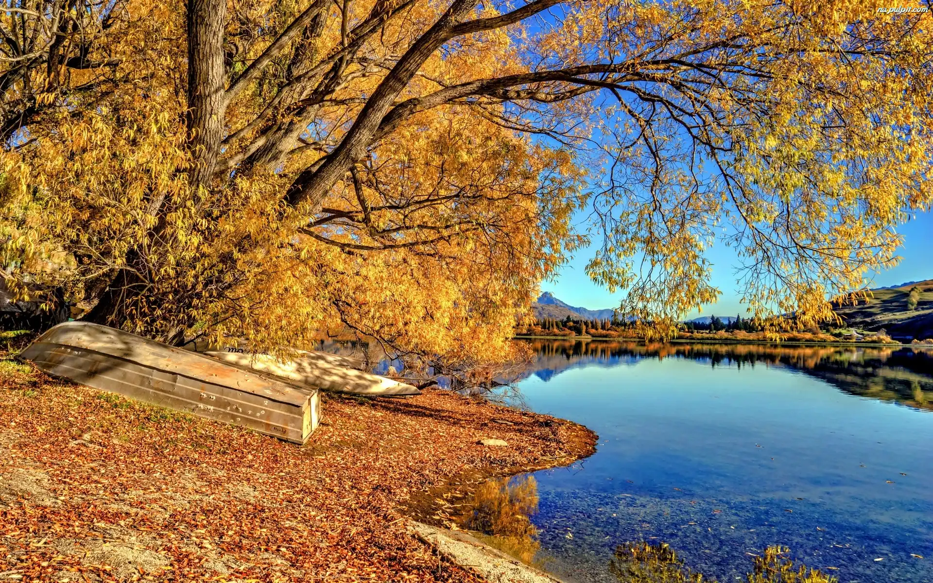Jesień, Hayes, Góry, Nowa, Zelandia, Lasy, Jezioro, Łódki