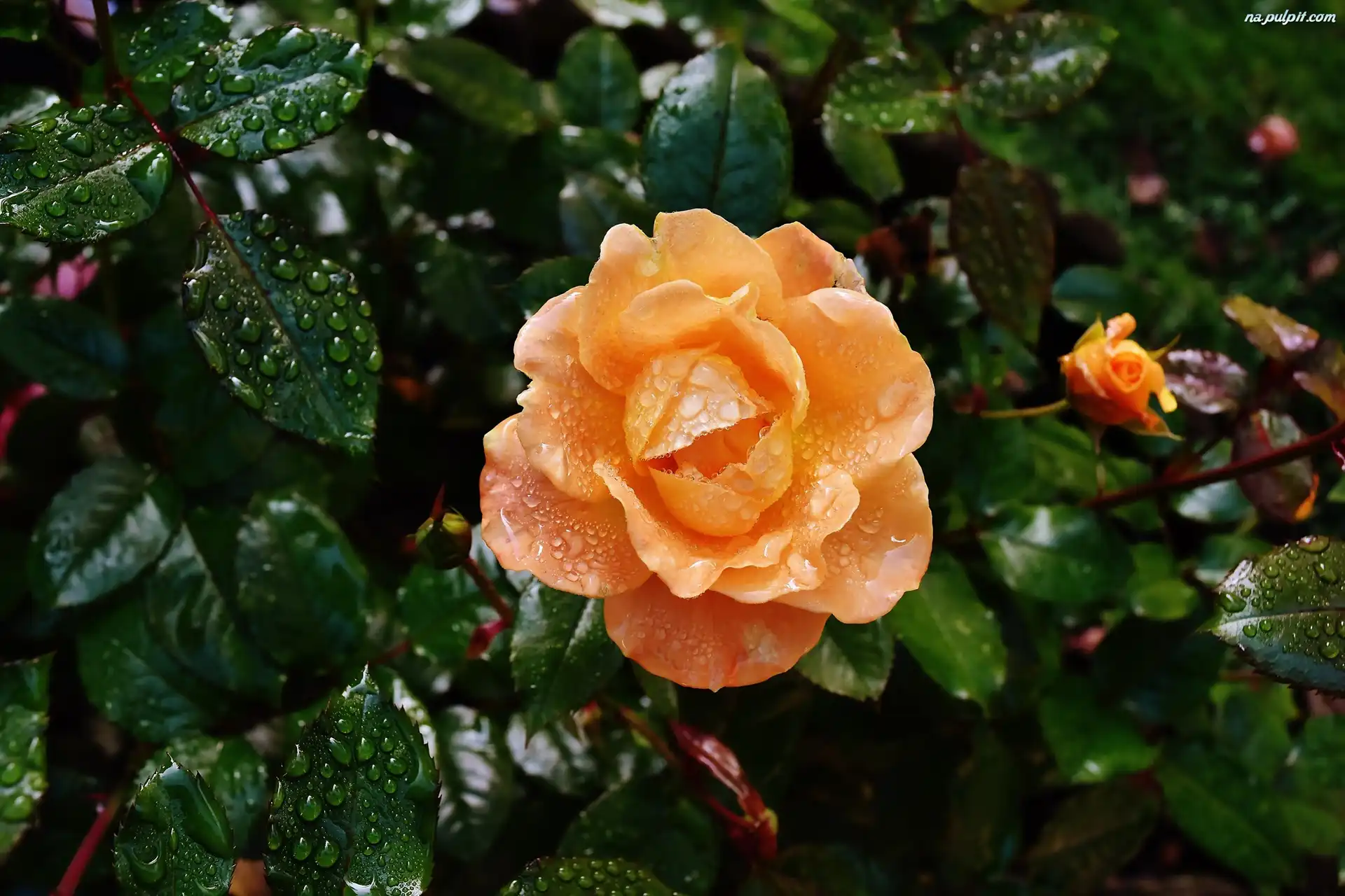 Krople, Herbaciana, Woda, Kwiat, Pomarańczowa, Róża, Liście Na Pulpit