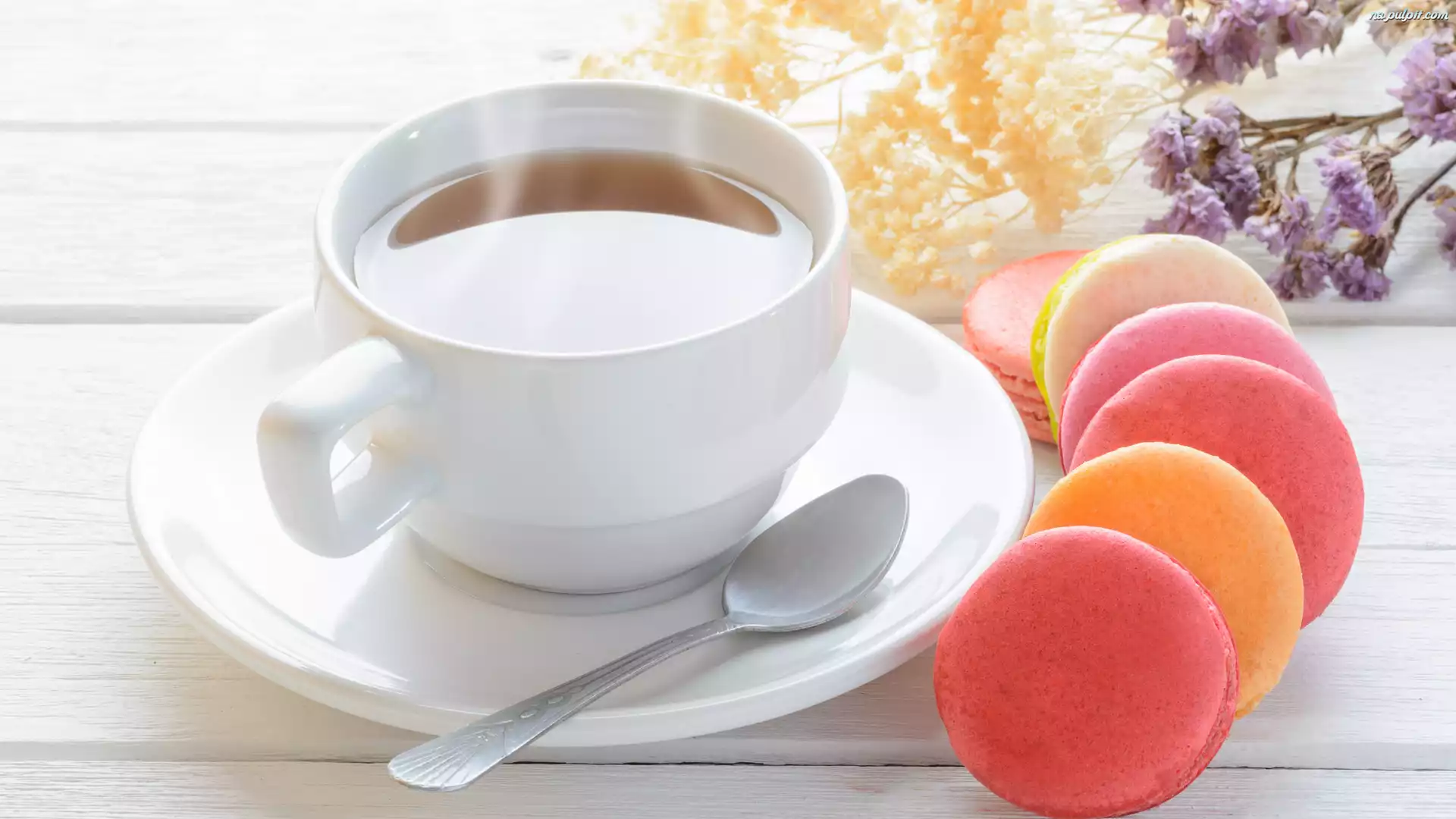 Herbata, Makaroniki, Ciasteczka, Kolorowe, Filiżanka