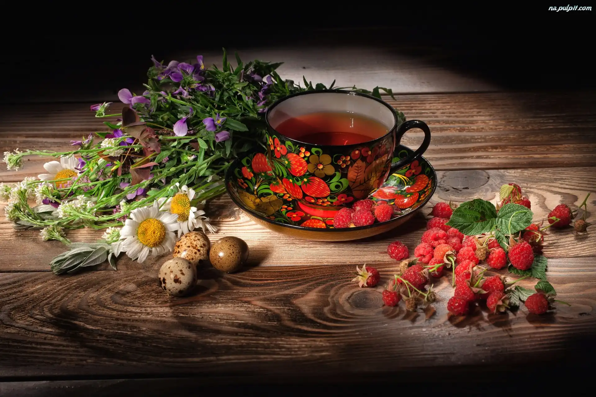 Polne, Filiżanka, Bratki, Kwiaty, Maliny, Jajeczka, Deski, Złocienie, Bukiet, Herbata