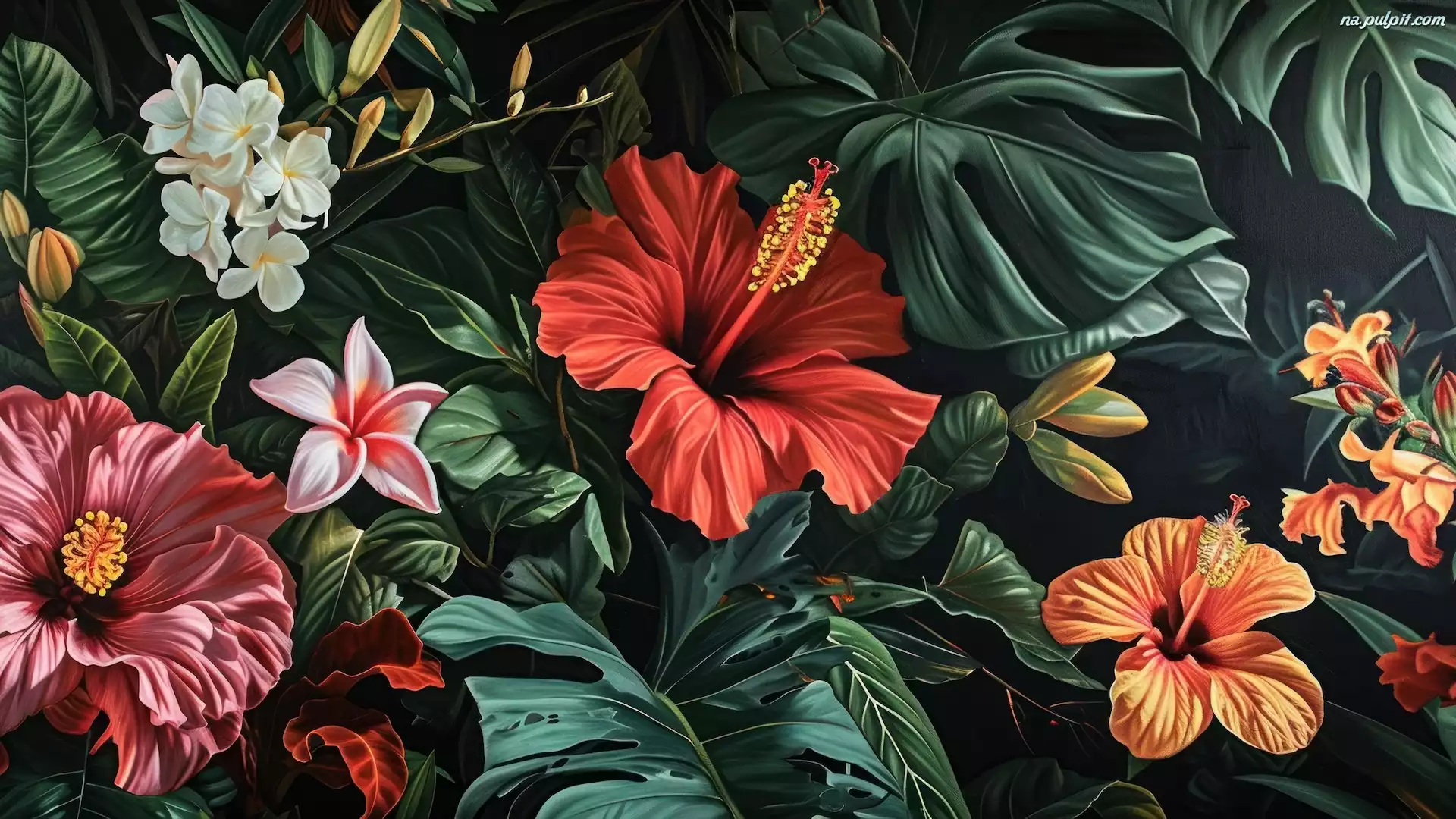Grafika, Kwiaty, Liście, Hibiskusy Na Pulpit