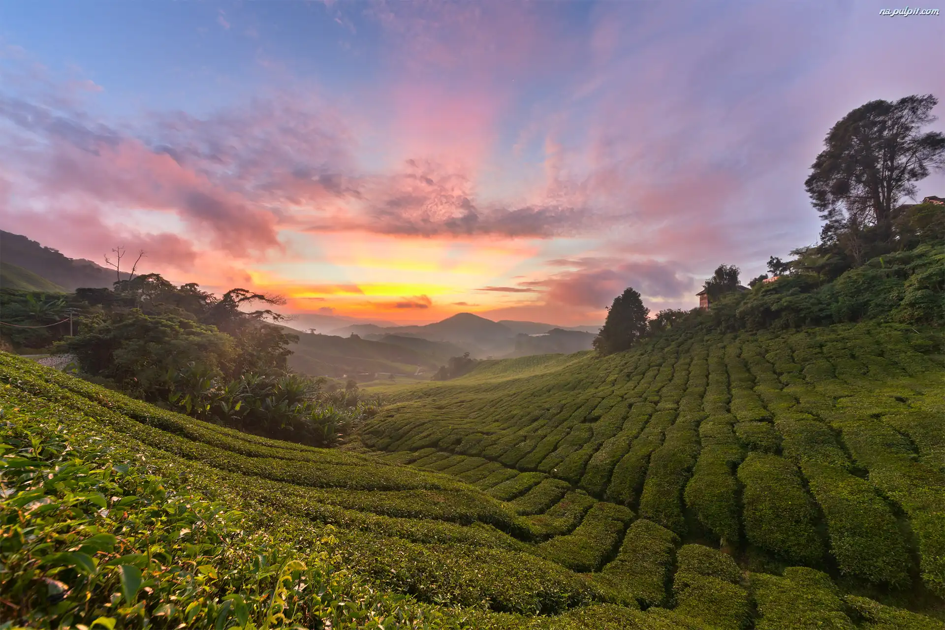 Malezja, Plantacja, Stan Pahang, Wschód słońca, Drzewa, Wzgórza, Cameron Highlands Na Pulpit