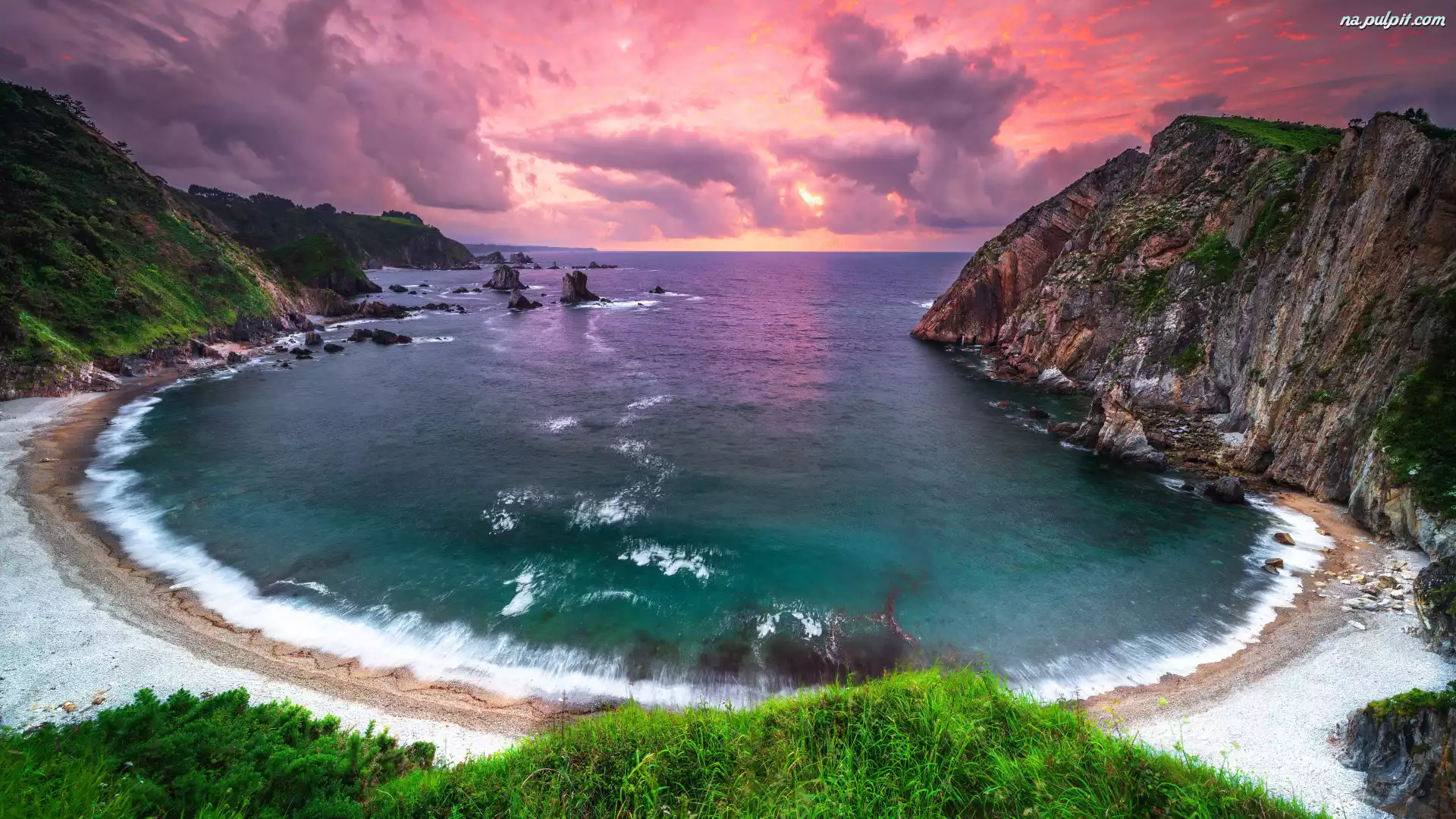 Plaża, Playa del Silencio, Asturia, Zachód słońca, Góry, Morze, Hiszpania, Zatoka, Skały Na Pulpit |