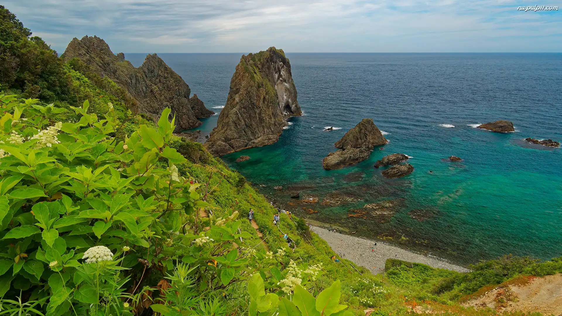 Japonia, Skały, Hokkaido, Punkt widokowy Shimamui Coast, Roślinność, Morze, Półwysep Shakotan Na Pulpit |