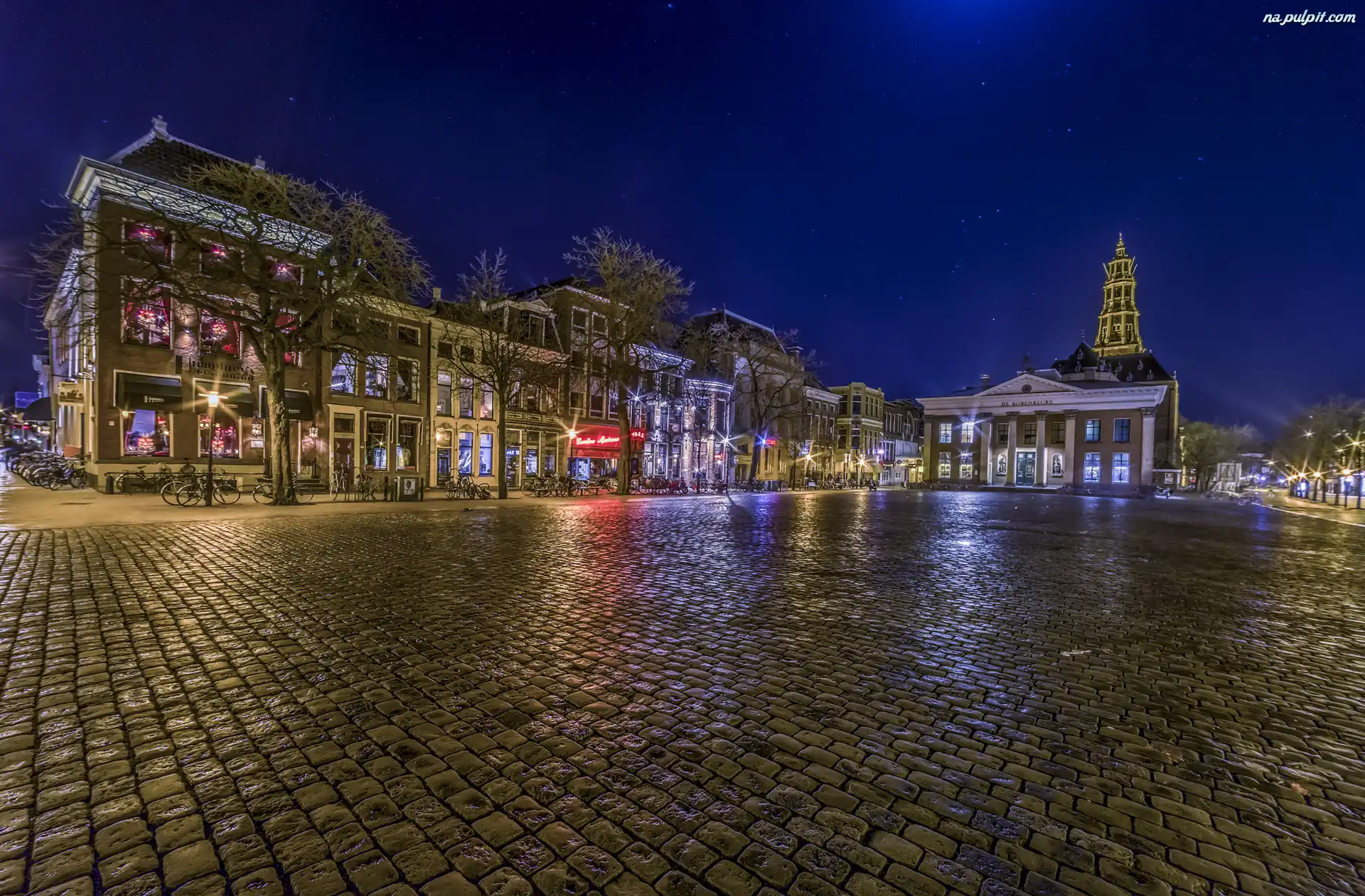 Światła, Plac, Domy, Holandia, Miasto, Groningen, Noc Na Pulpit