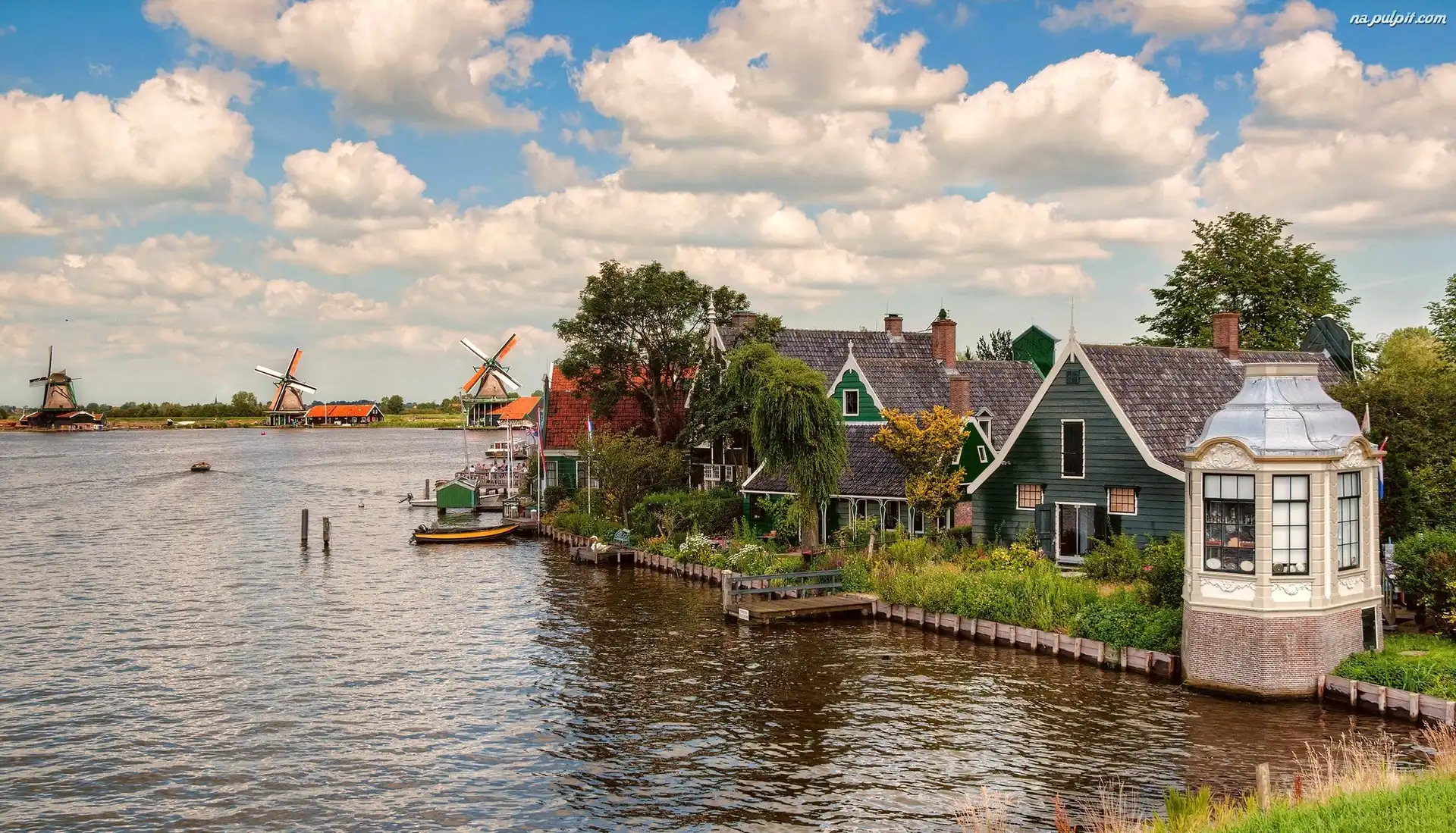 Holandia, Domy, Rzeka, Wiatraki Na Pulpit