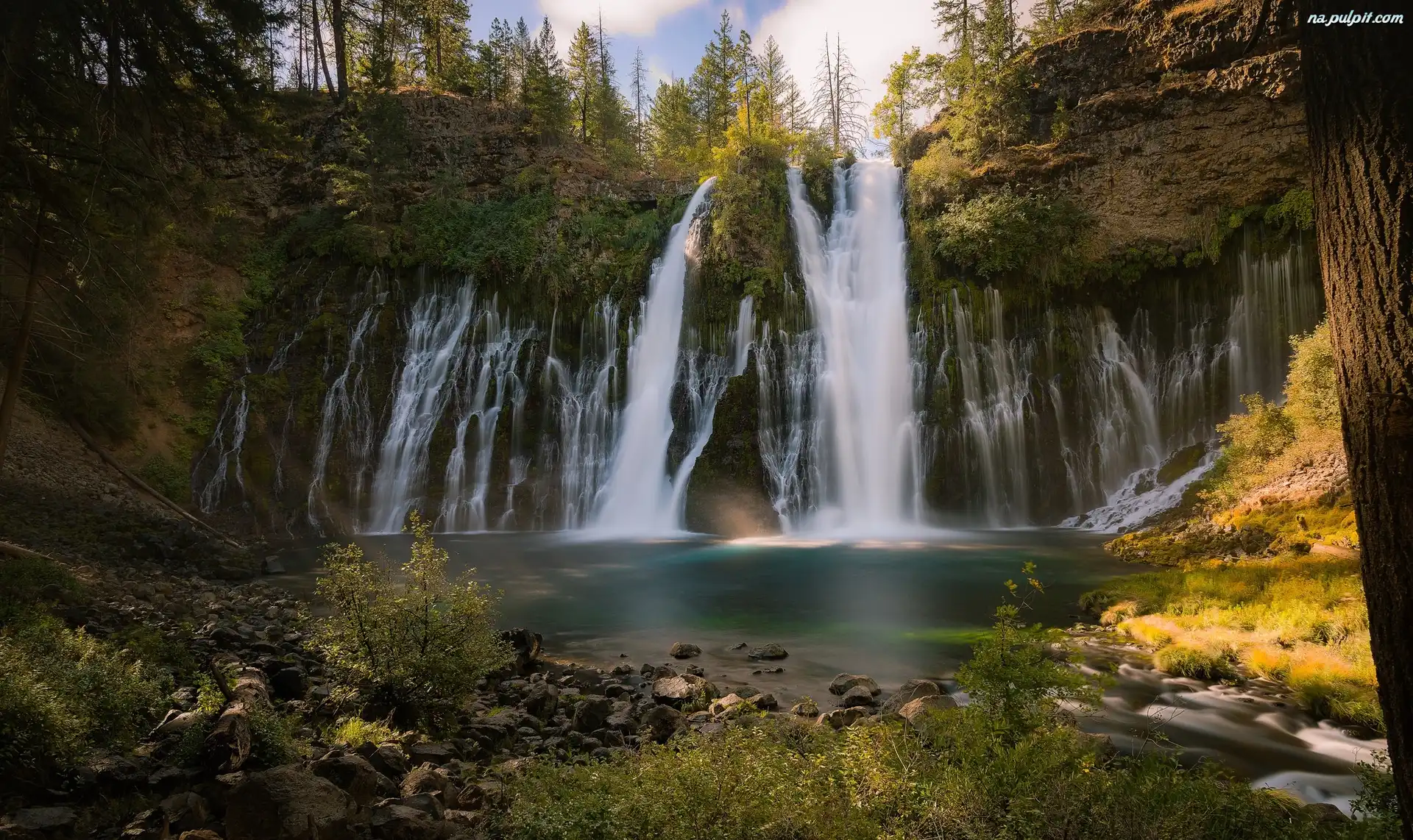 Hrabstwo Shasta, Drzewa, Rzeka, Stan Kalifornia, Stany Zjednoczone, Skała, Wodospad Burney Falls, Park McArthur-Burney Falls Na Pulpit |