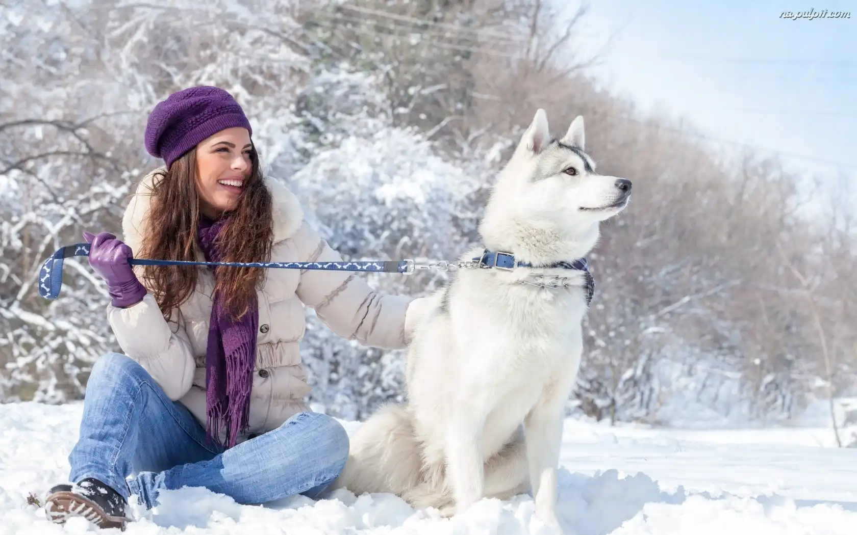 Śnieg, Brunetka, Siberian Husky, Zima Na Pulpit