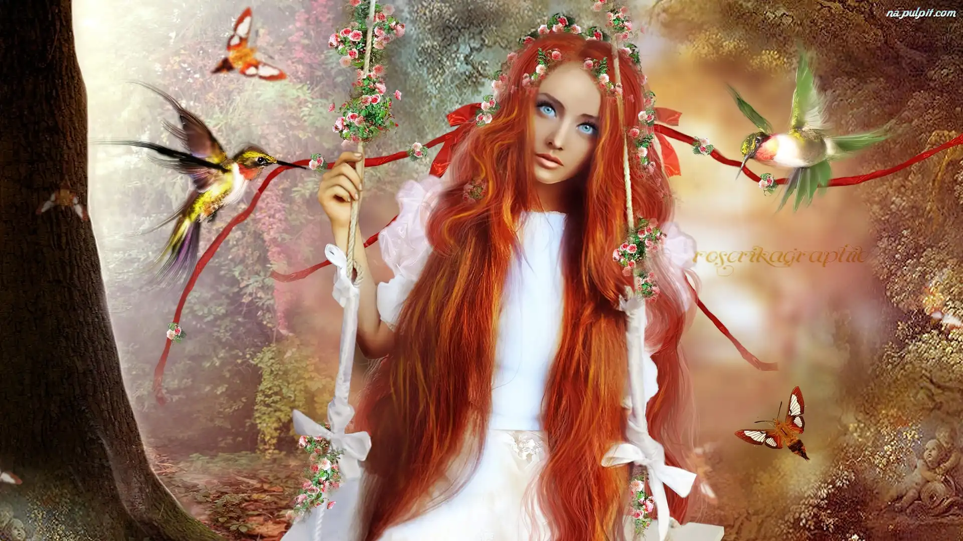 Huśtawka, Kobieta, Fantasy, Ptaki