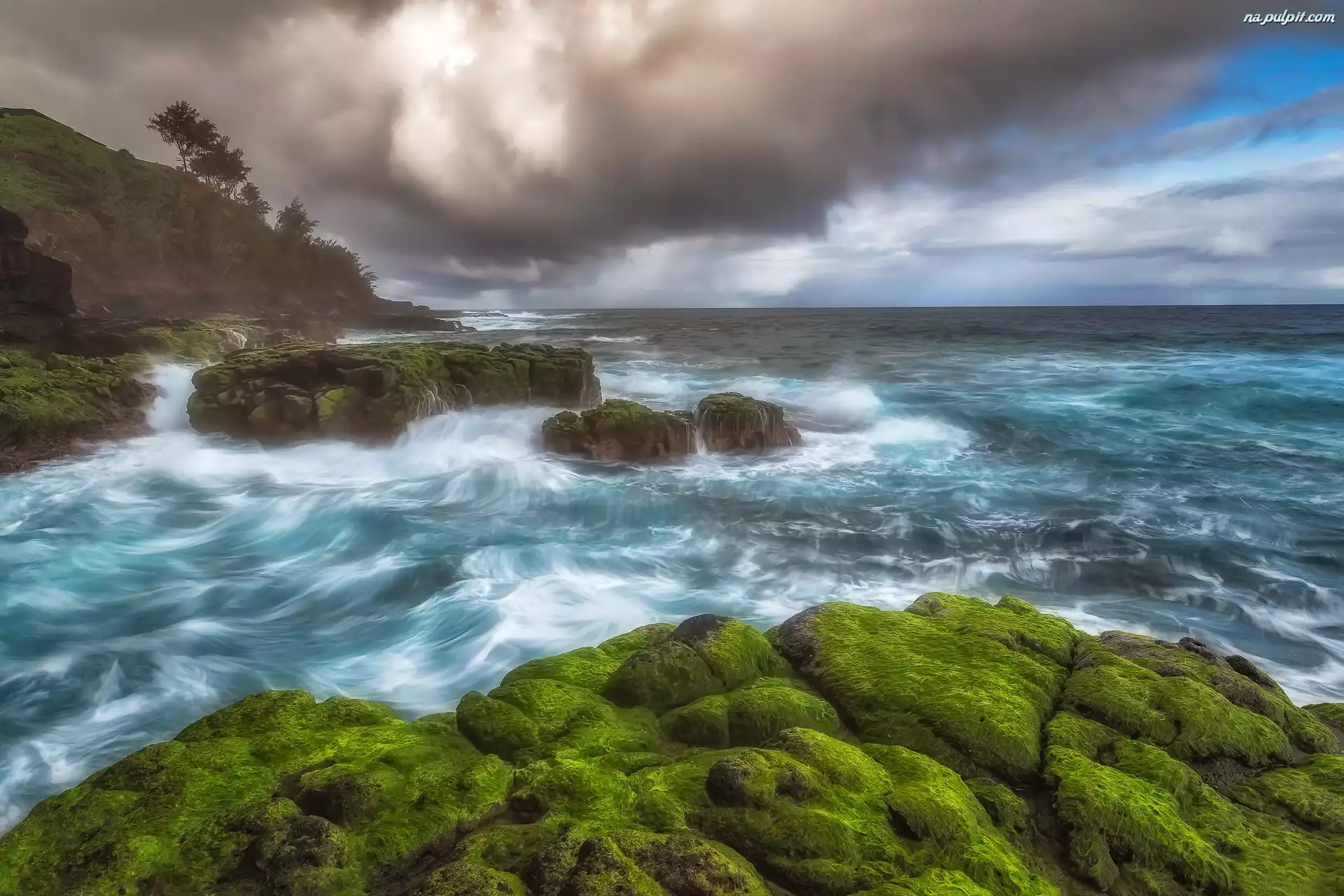 Chmury, Wybrzeże, Wyspa Kauaʻi, OmszaÅ‚e, SkaÅ‚y, Ocean Spokojny, Hawaje, Drzewa