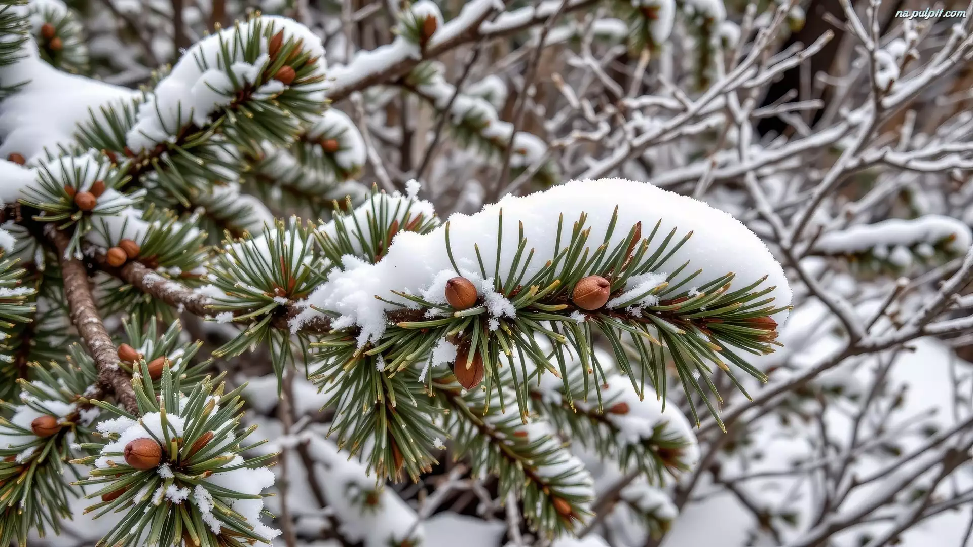 Zima, Ośnieżona, Gałązka, Iglak Na Pulpit