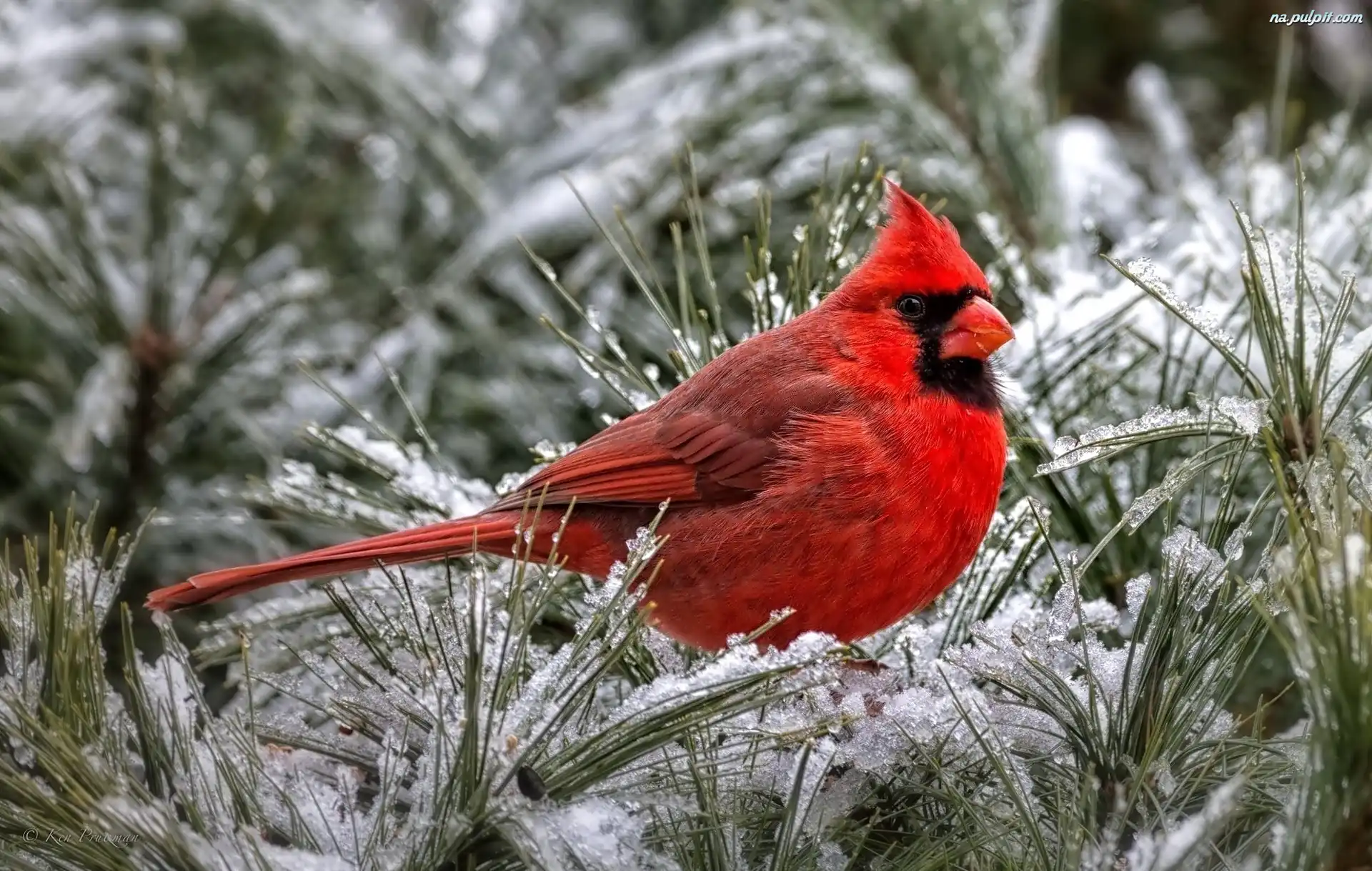 Iglaki, Ośnieżone, Kardynał, Ptak, Gałązki Na Pulpit
