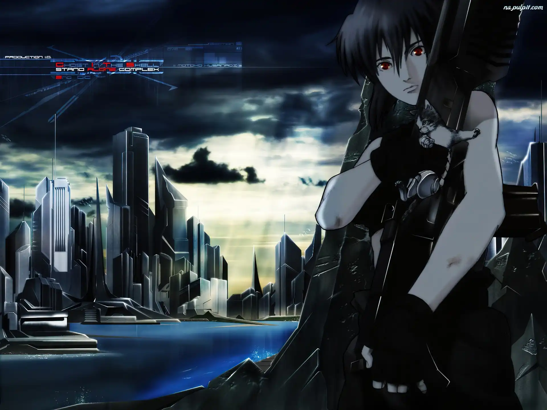 Ghost In The Shell, kotek, broń, postać, miasto Na Pulpit