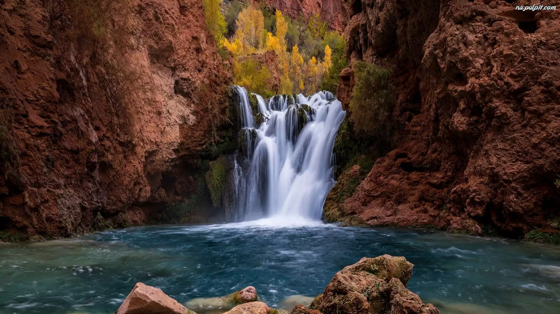 Rzeka, Drzewa, Arizona, Grand Canyon, Havasupai Indian Reservation, Park Narodowy Wielkiego Kanionu, Stany Zjednoczone, Wodospad, Skały Na Pulpit |