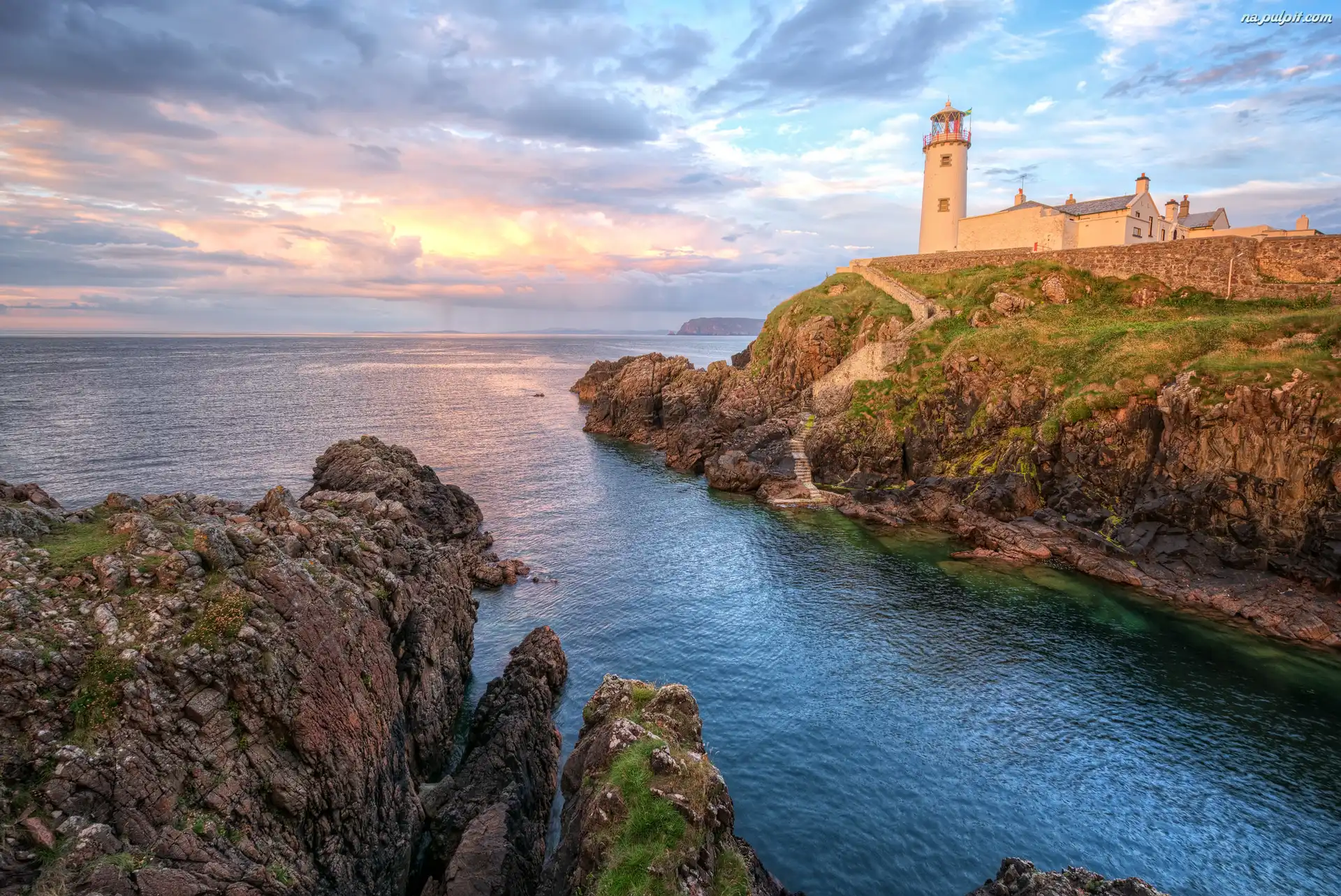 Irlandia Północna, Latarnia morska Fanad Head Lighthouse, Portsalon, Wschód słońca, Skały, Morze, Chmury Na Pulpit |