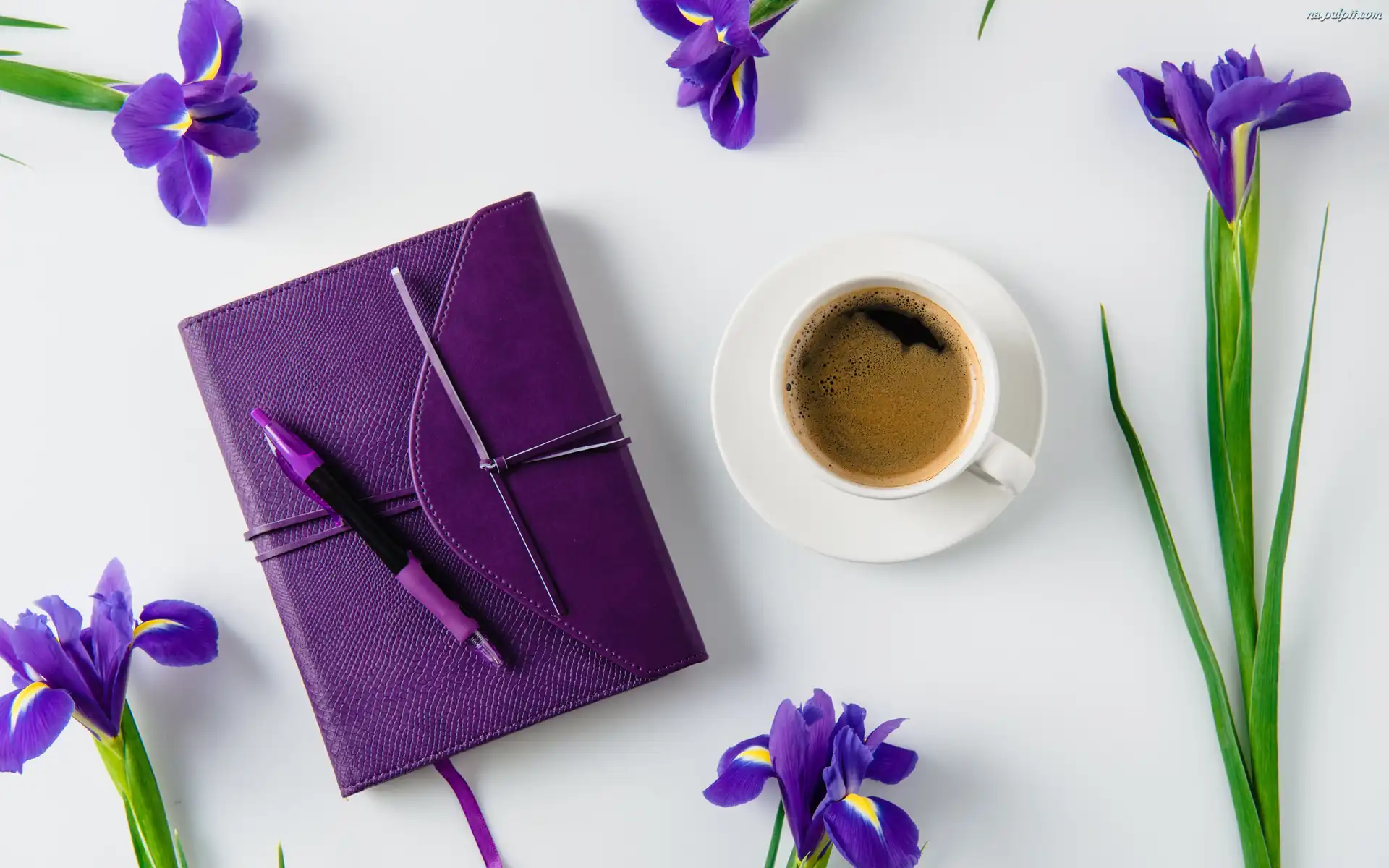 Notes, Irysy, Kawa, Prezent, Długopis, Filiżanka, Kwiaty, Talerzyk