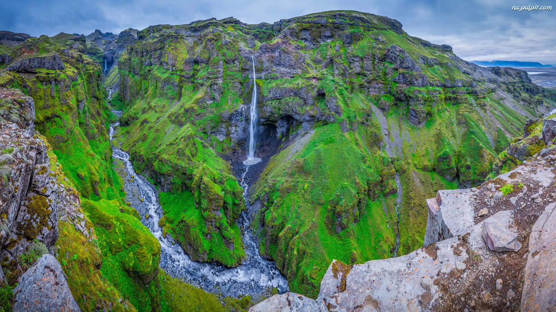 Góry, Kanion Mulagljufur, Omszałe, Skały, Wodospad Hangandifoss, Islandia Na Pulpit