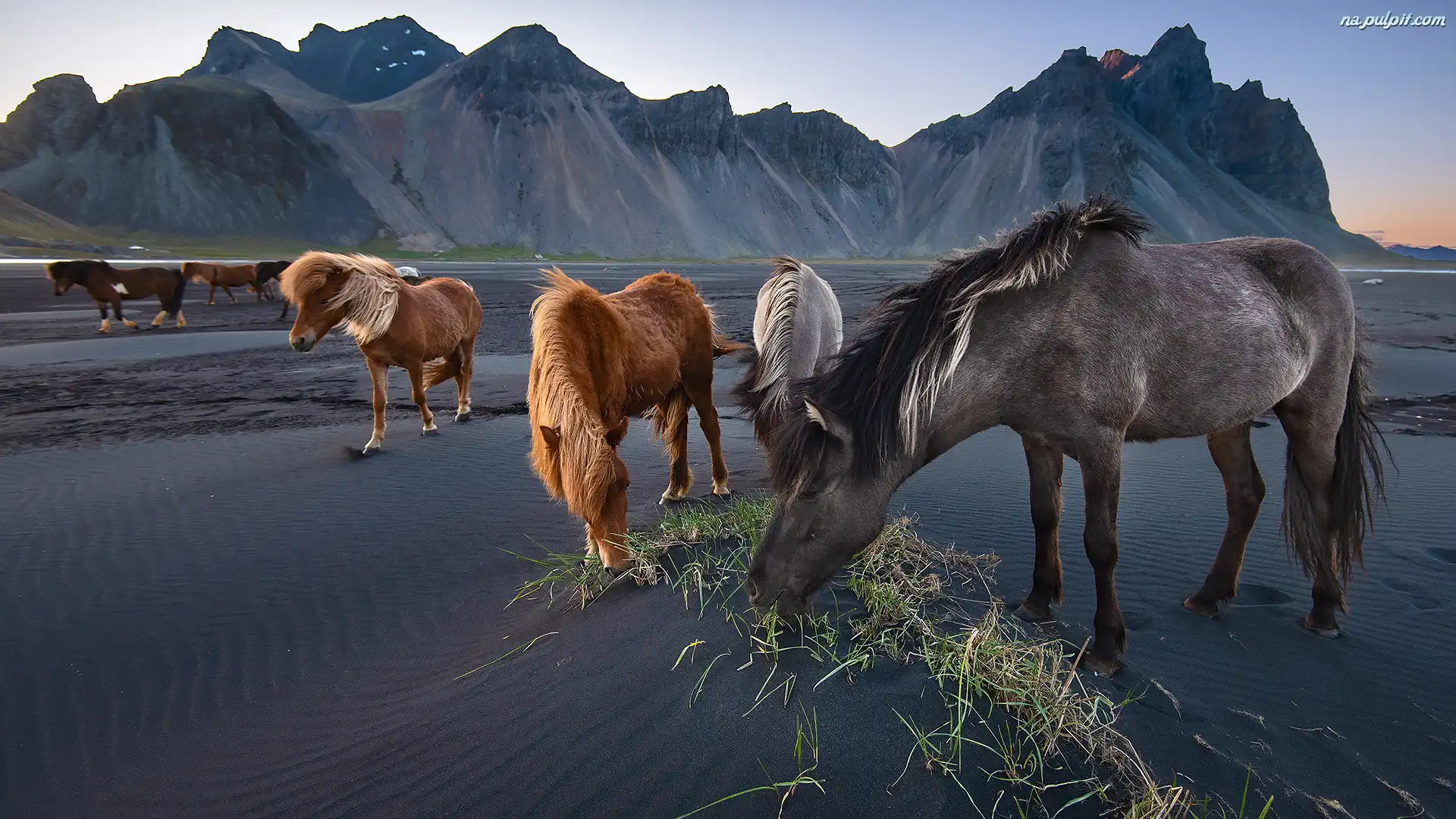 Piasek, Góra Vestrahorn, Ciemny, Plaża Stokksnes, Góry, Konie, Islandia Na Pulpit