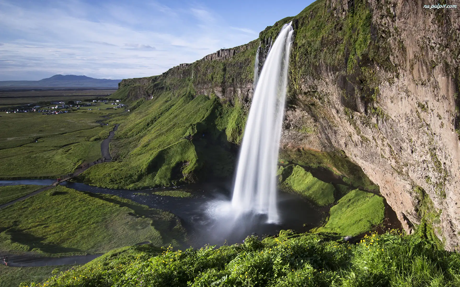 Islandia, Łąki, Skała, Wodospad Seljalandsfoss Na Pulpit