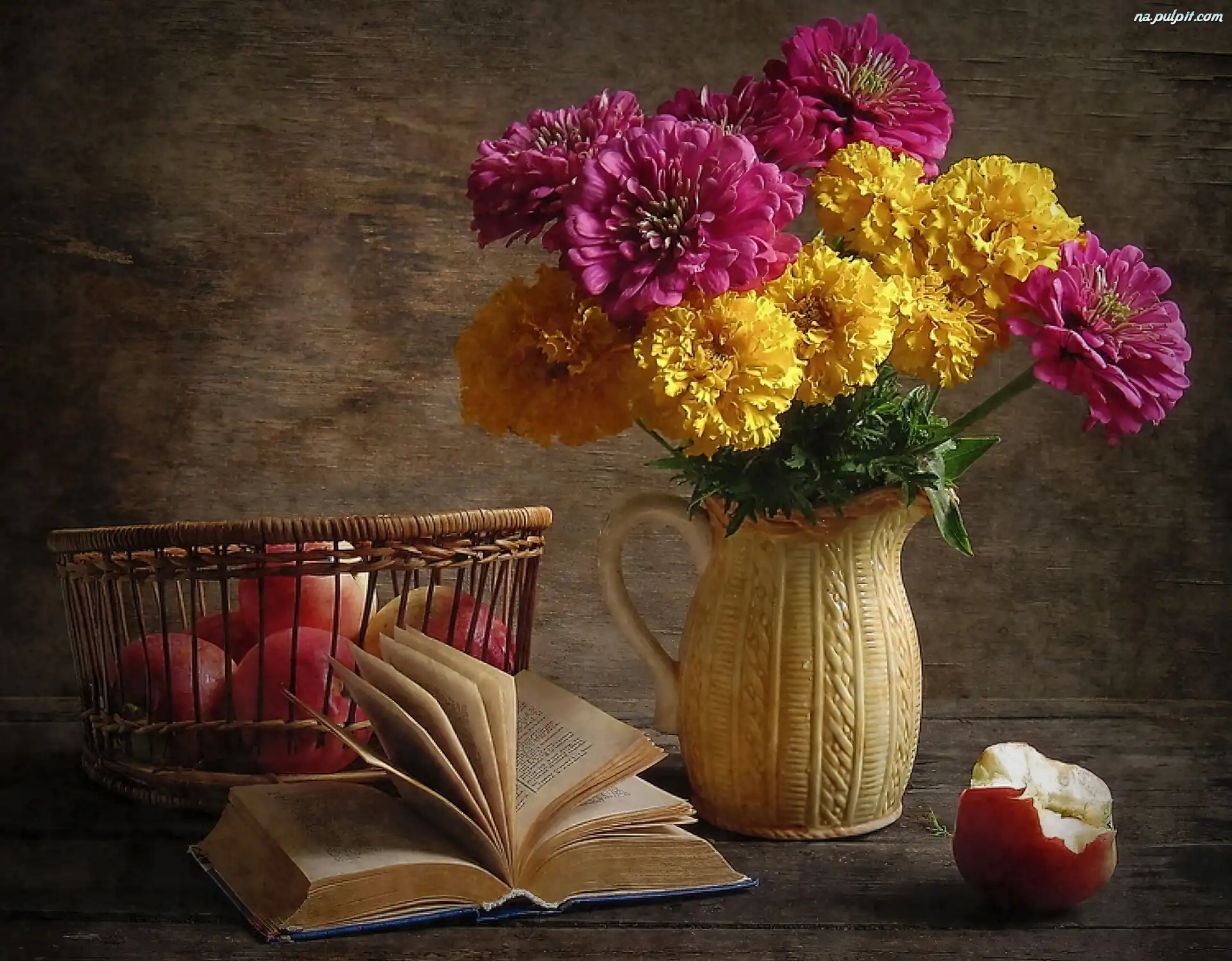 Jabłka, Kwiatów, Bukiet, Dzban, Książka
