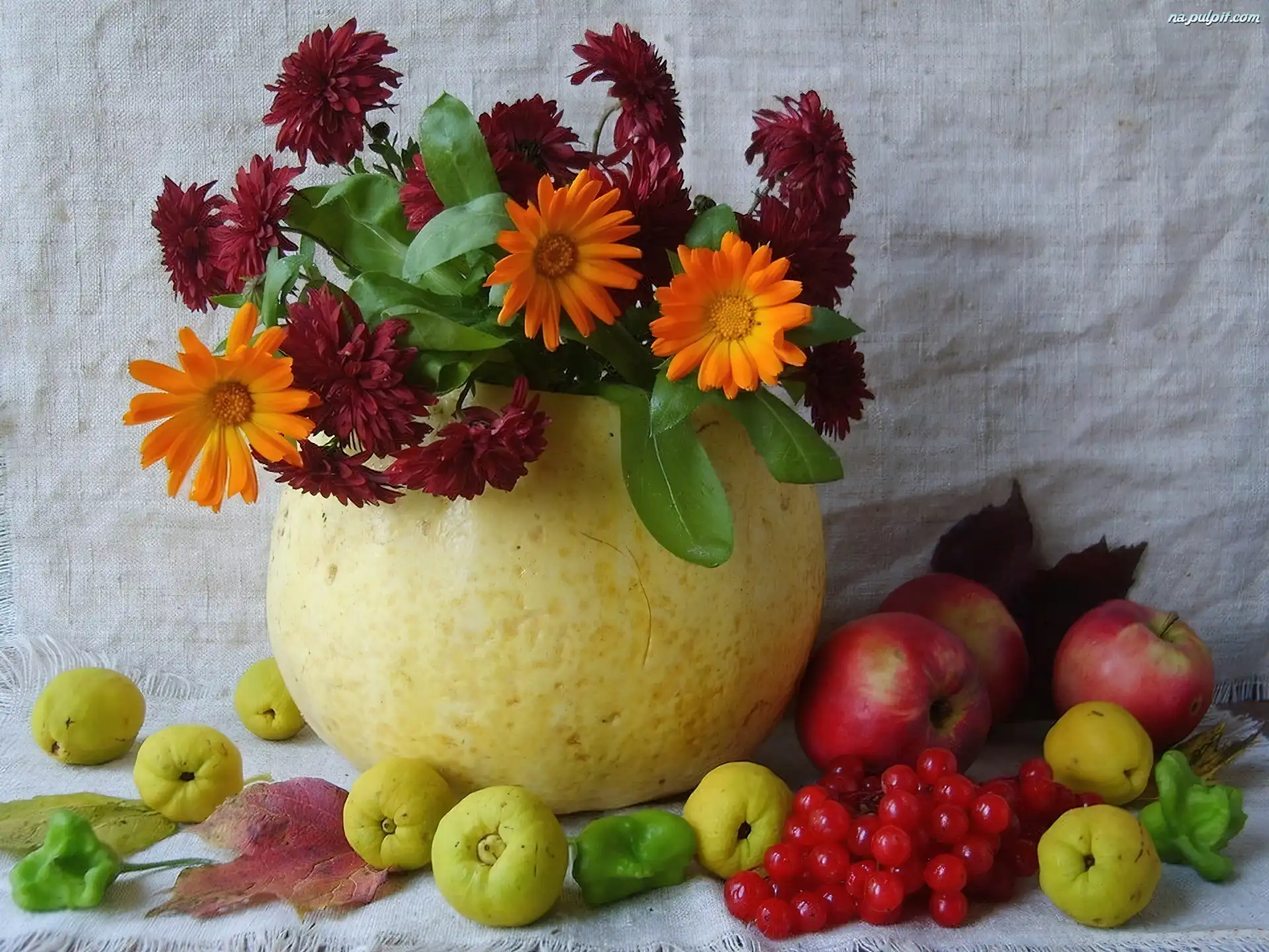 Jabłka, Owoce, Chryzantemy, Flakon, Pigwy Na Pulpit