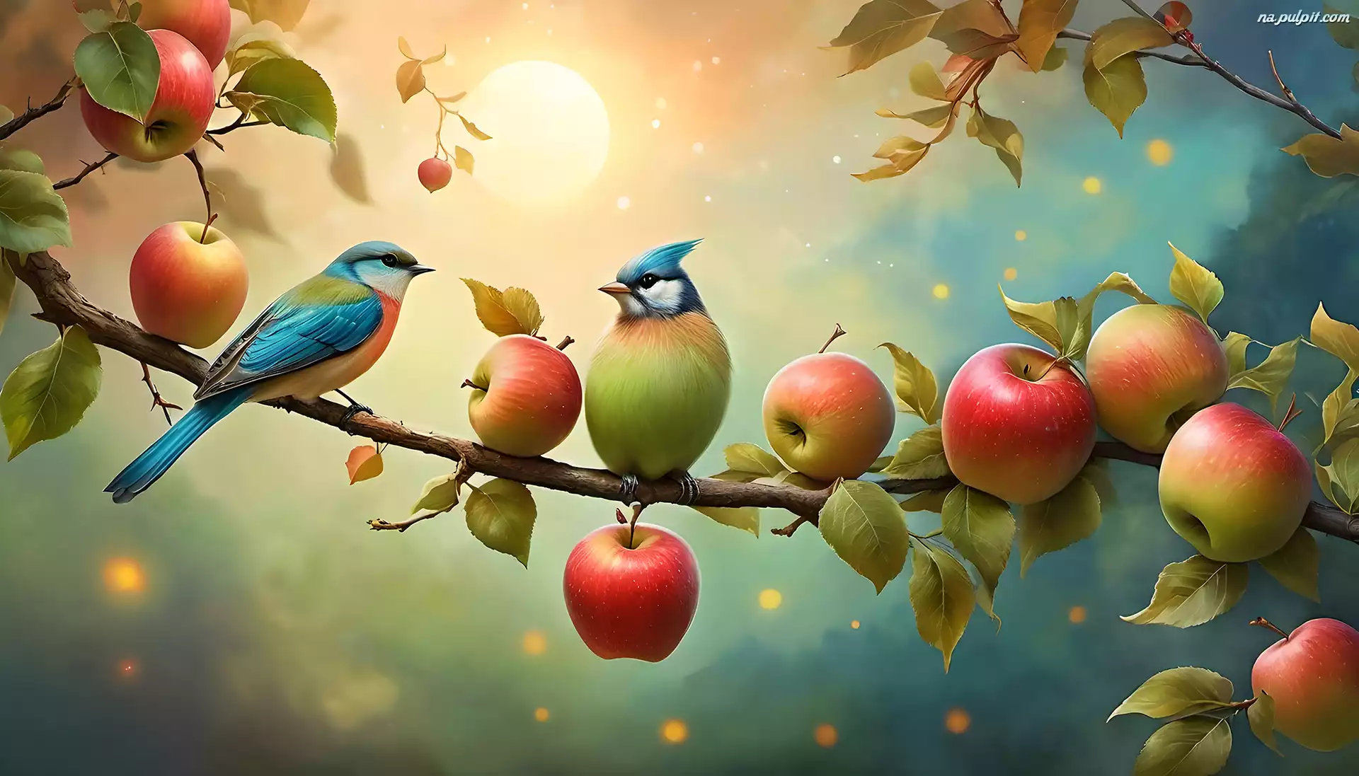 Gałązka, Dwa, Ptaki, Jabłka, Kolorowe, Grafika Na Pulpit