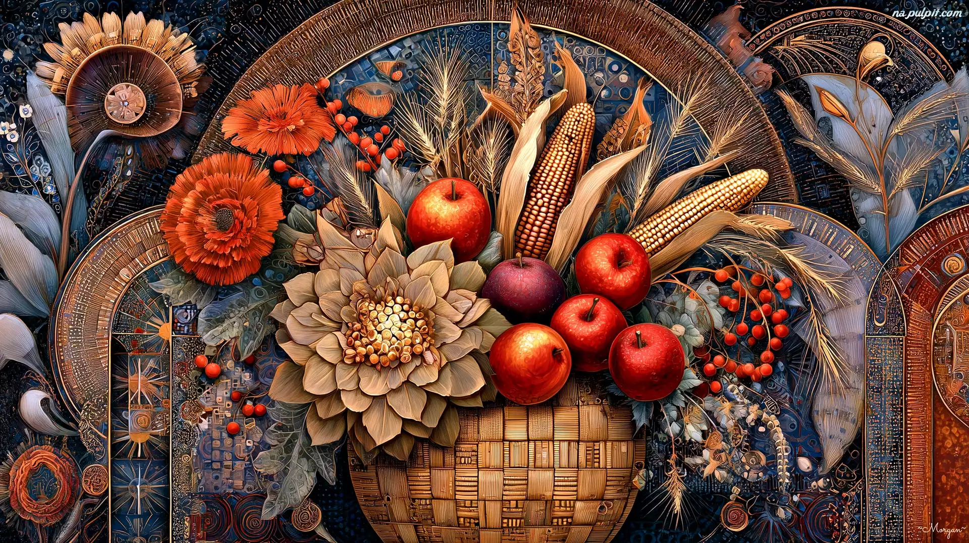 Kosz, Jabłka, Kwiaty, Grafika AI Na Pulpit