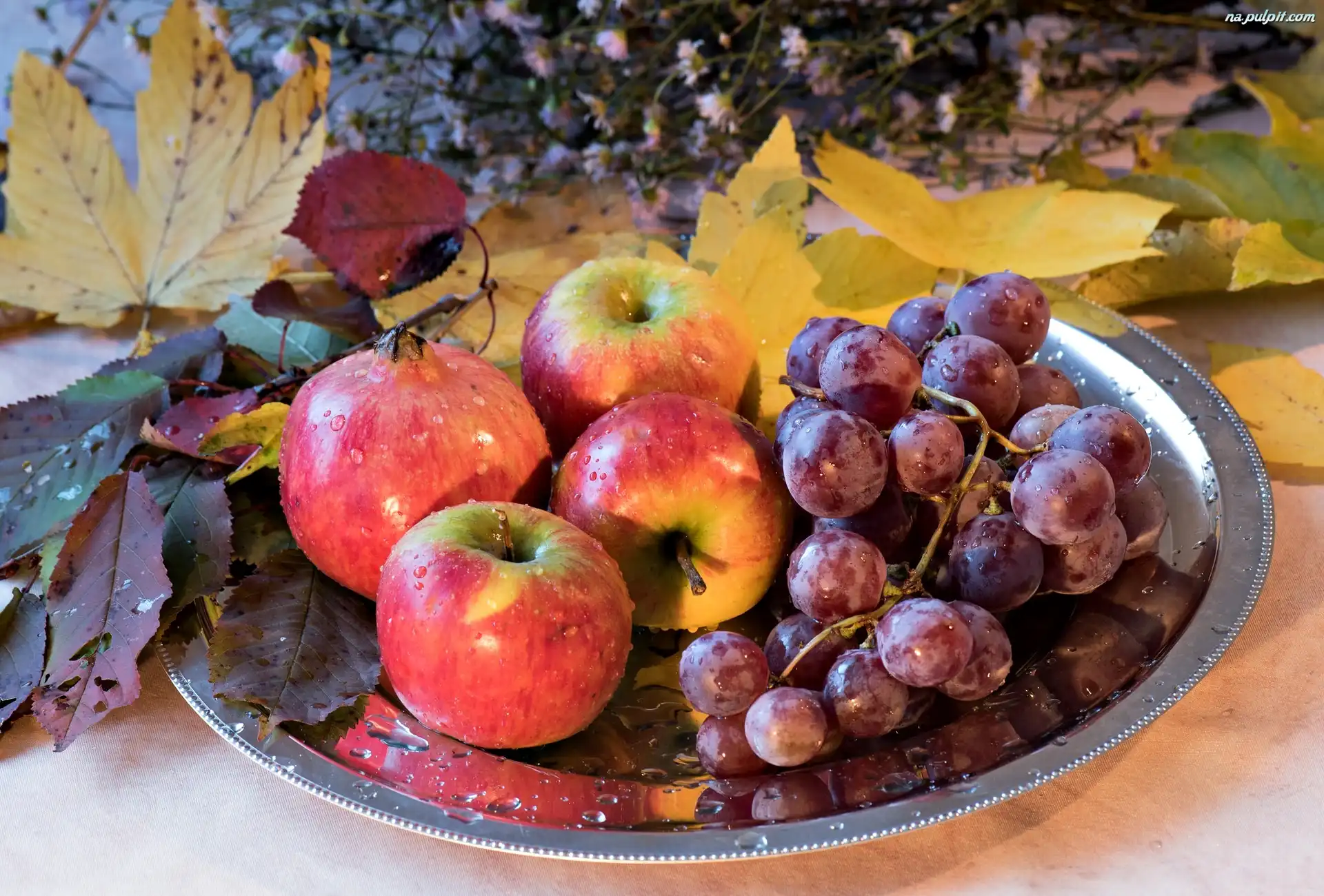 Jabłka, Taca, Kompozycja, Granat, Winogrona, Liście Na Pulpit