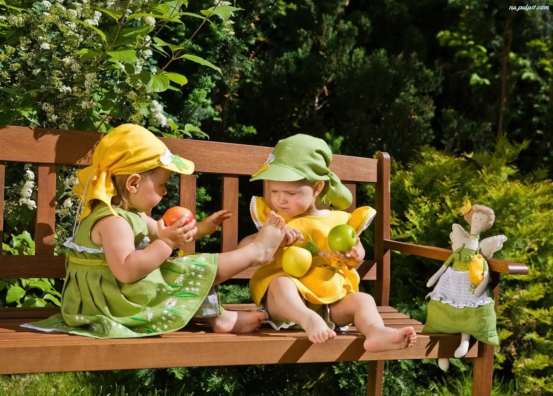 Jabłuszka, Dwie, Ławka, Ogród, Dziewczynki Na Pulpit