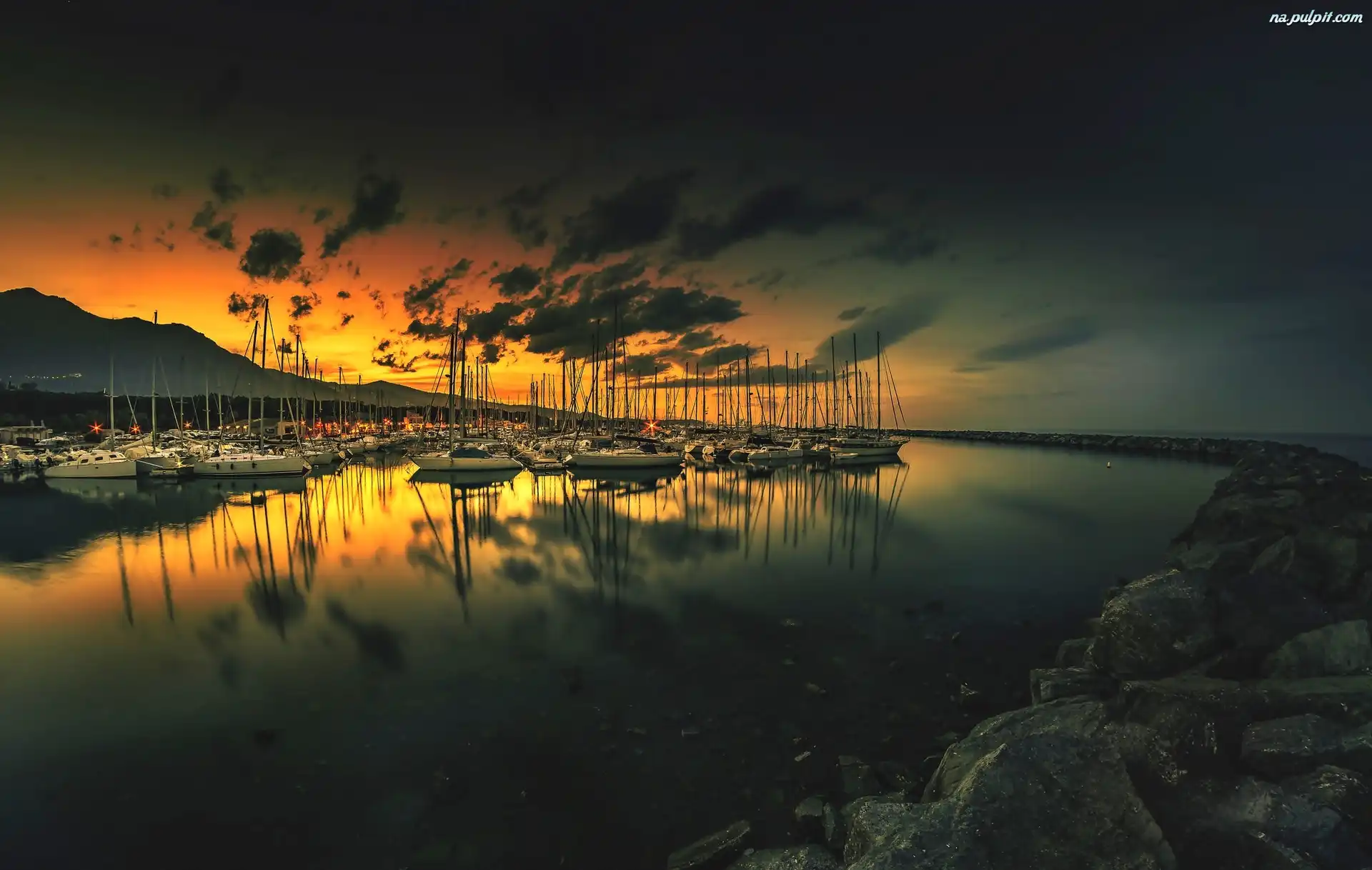 Jachty, Skały, Jezioro, Zachód Słońca Na Pulpit
