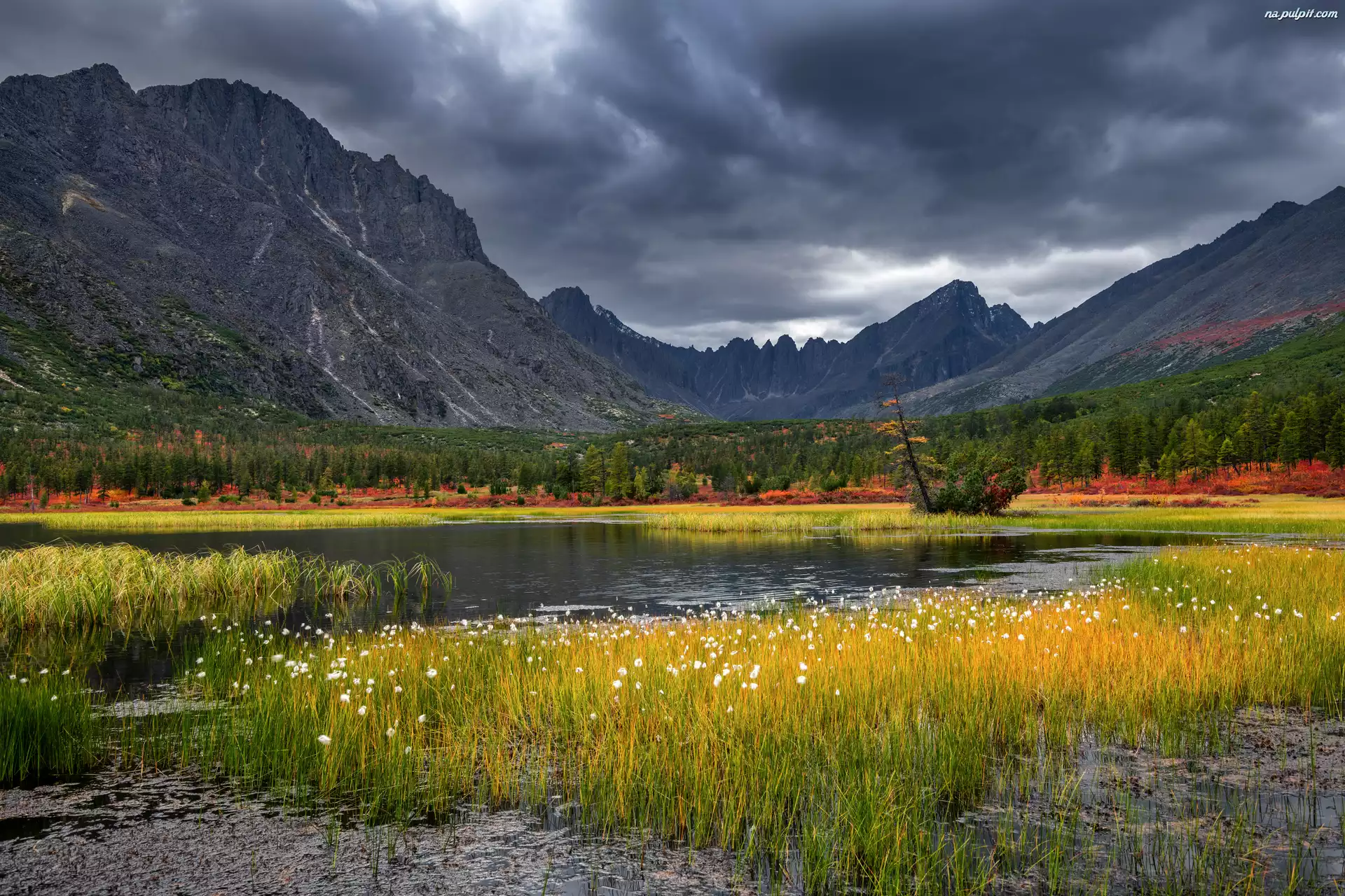Jack London Lake, Góry, Drzewa, Rosja, Chmury, Trawa, Kołyma, Jezioro