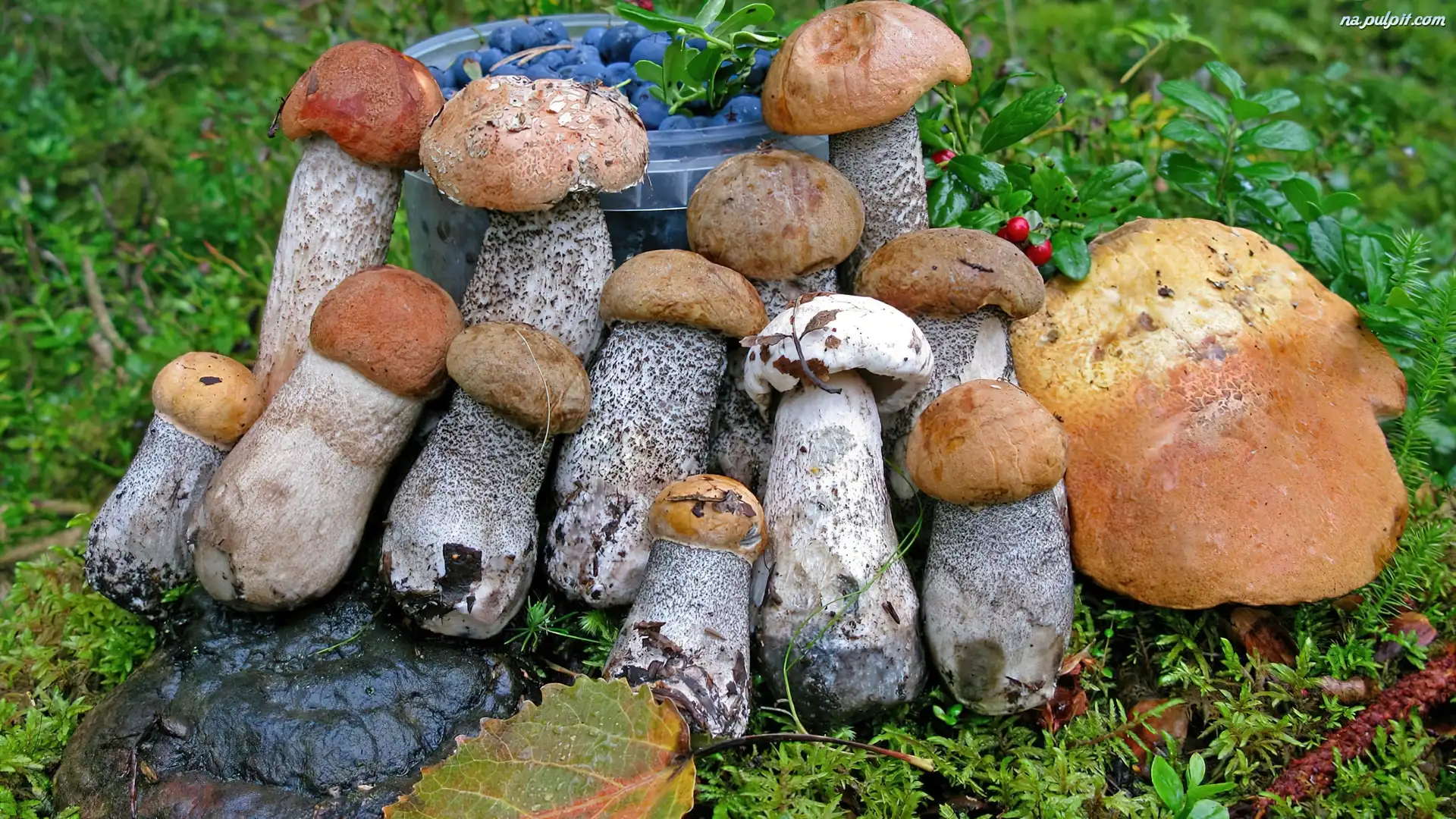 Jagody, Liście, Mech, Wiaderko, Grzyby, Kraśniak Na Pulpit