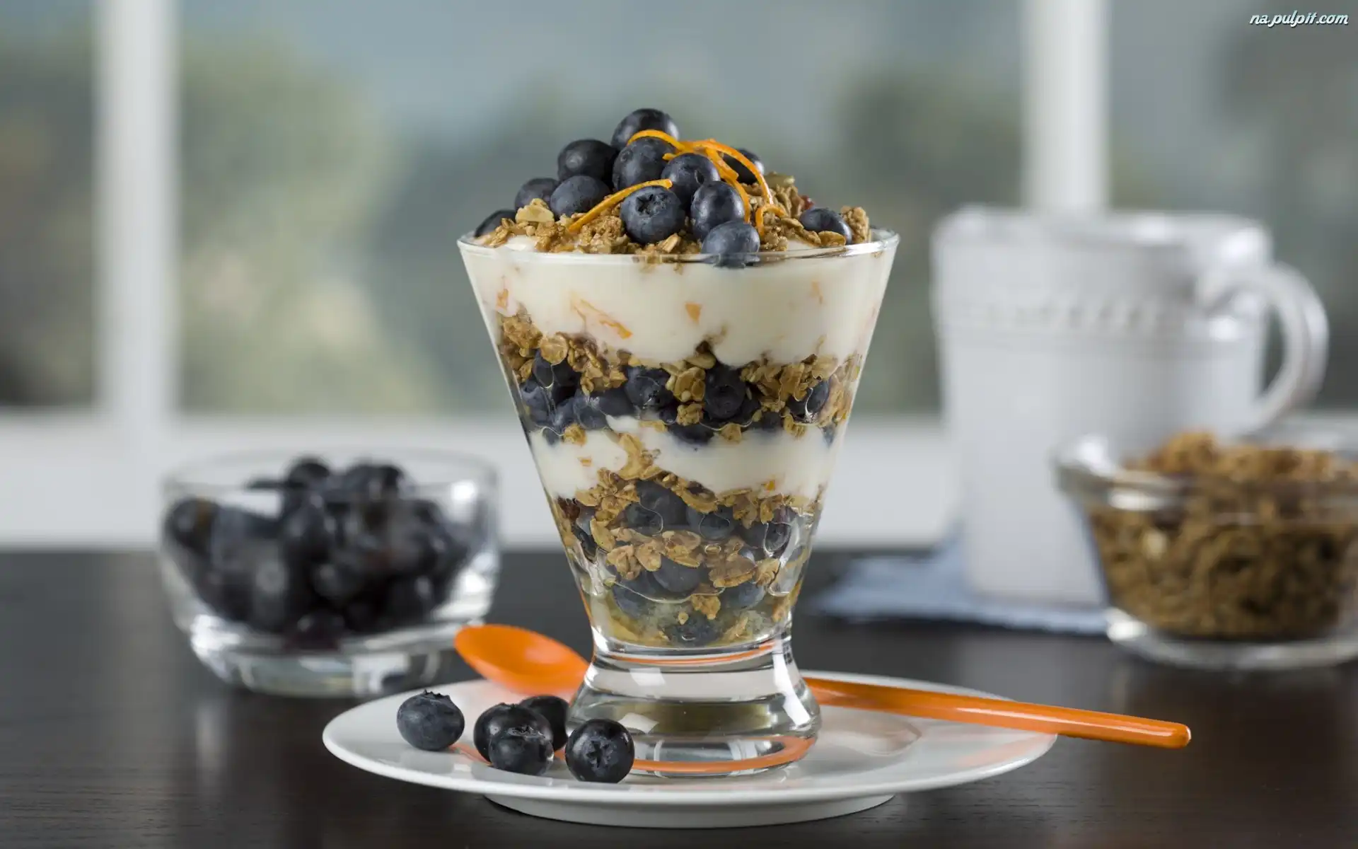 Spodki, Jagody, Łyżeczka, Szklanka, Płatki, Deser, Żółta Na Pulpit