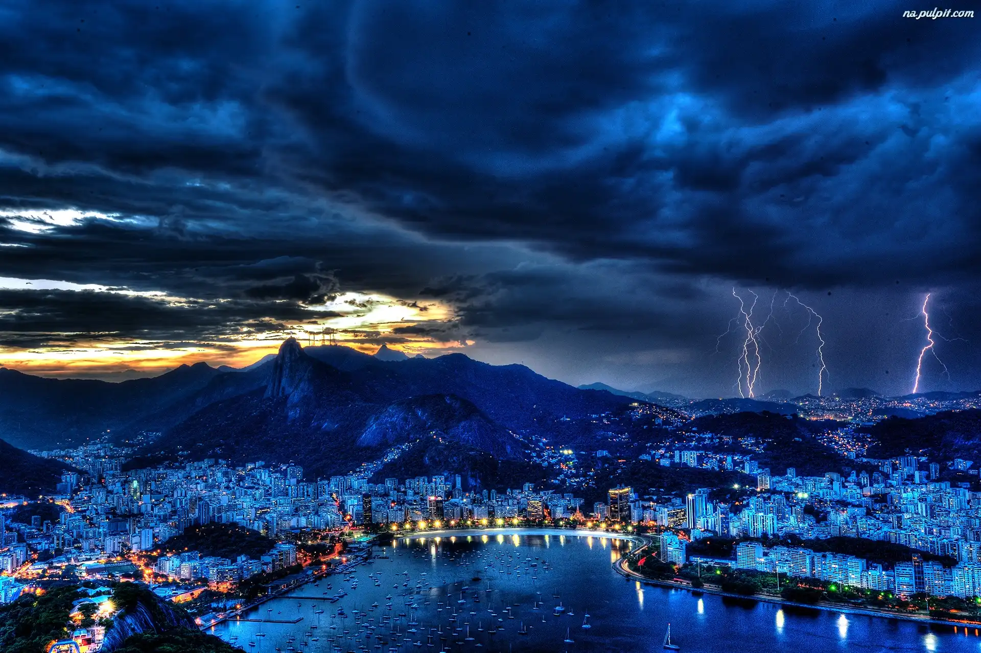 Noc, Góry, Chmury, Miasta, Panorama, Rzeka, Rio de Janerio Na Pulpit