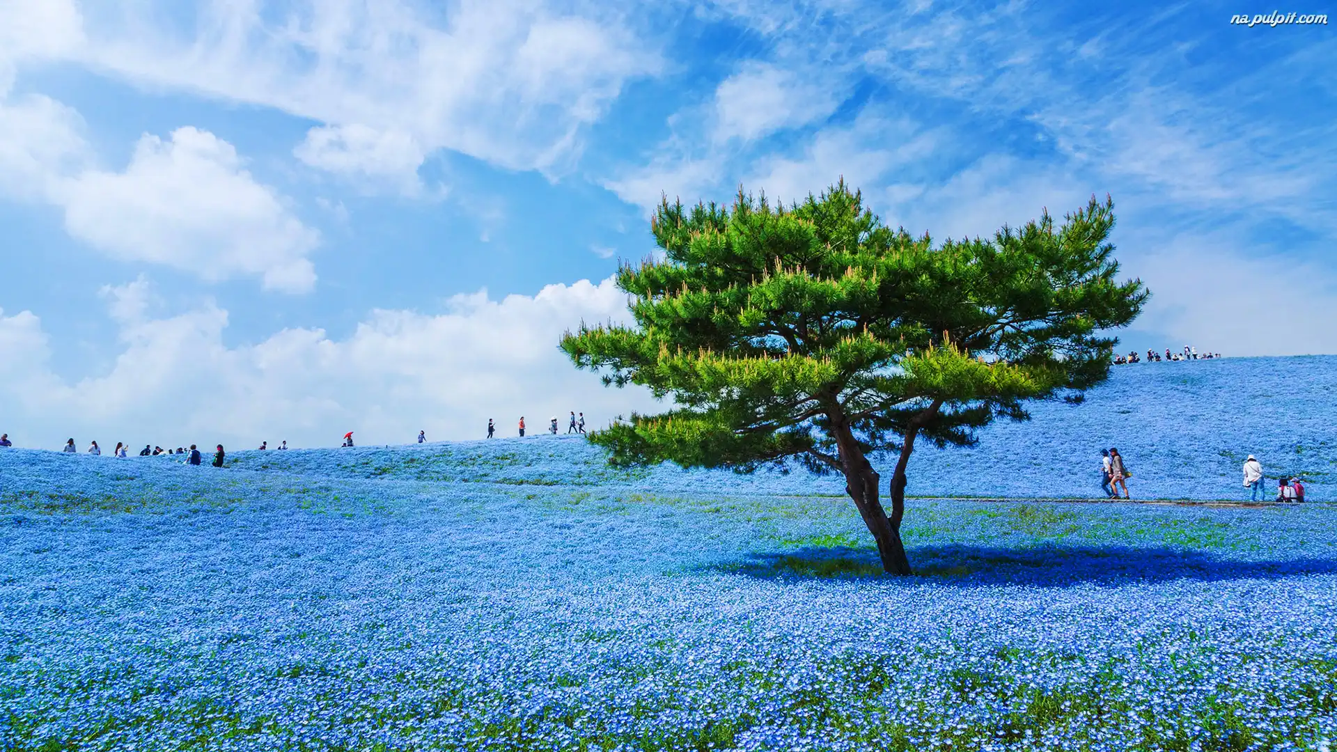 Drzewo, Kwiaty, Hitachi Seaside Park, Łąka, Japonia, Hitachinaka, Niebieskie, Porcelanki Menziesa Na Pulpit |