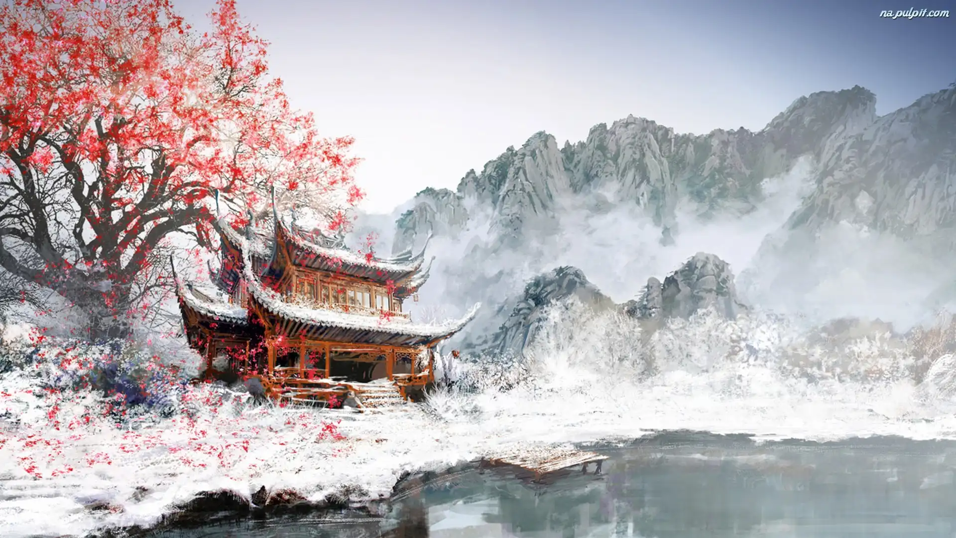 Japoński, Drzewo, Góry, Zima, Domek Na Pulpit