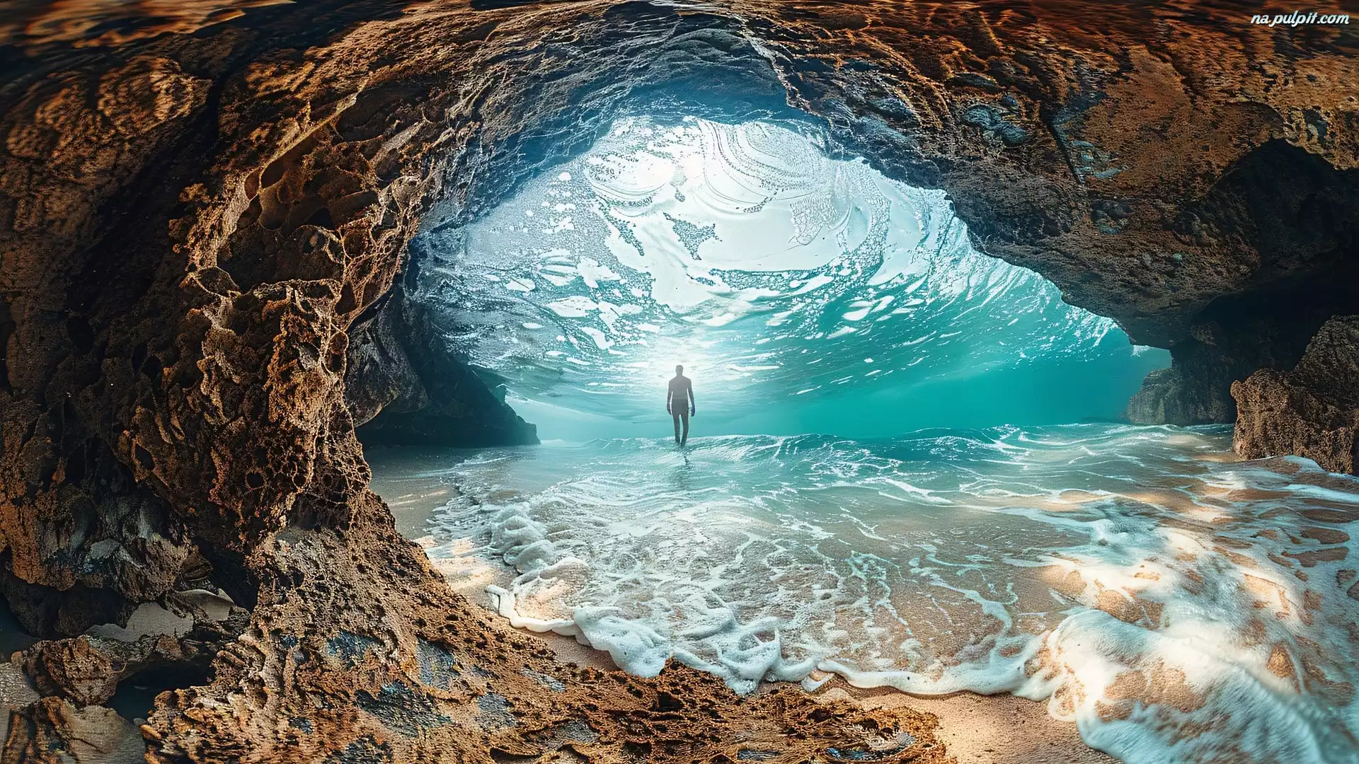 Skała, Fotomontaż, Fala, Jaskinia, Morze, Człowiek Na Pulpit