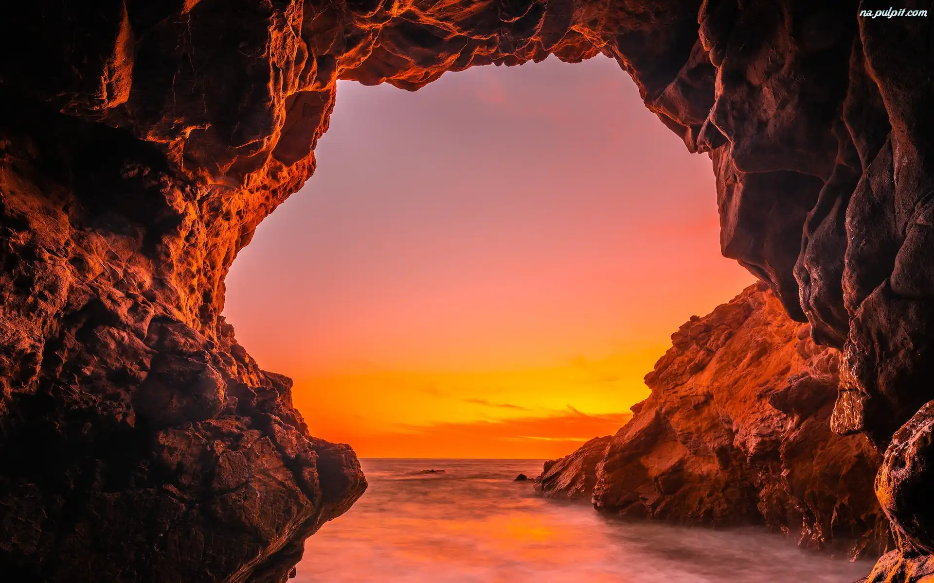 Zachód słońca, Kalifornia, Skały, Morze, Malibu, Stany Zjednoczone, Jaskinia Na Pulpit