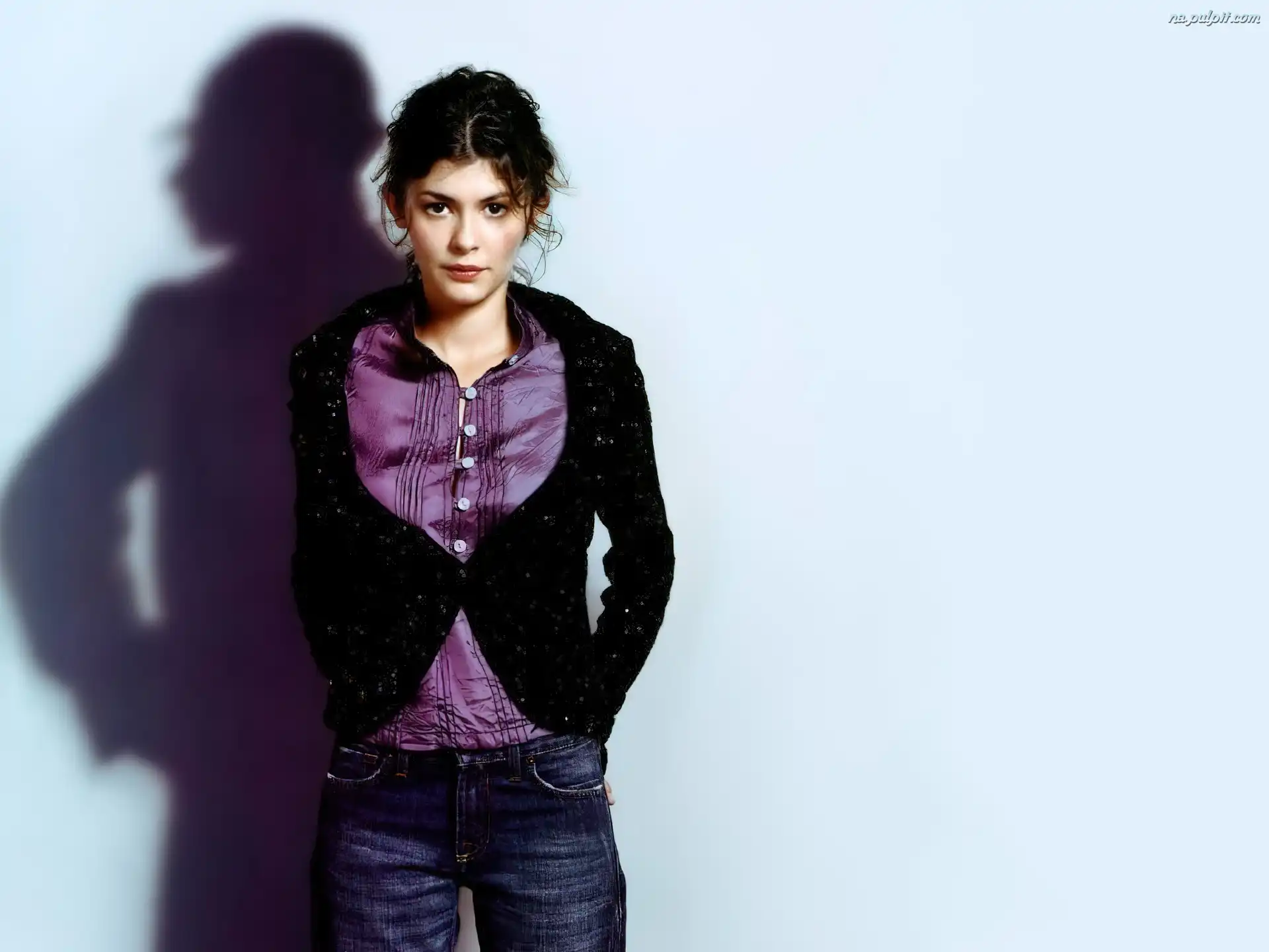 jeansy, Audrey Tautou, fioletowa koszula Na Pulpit